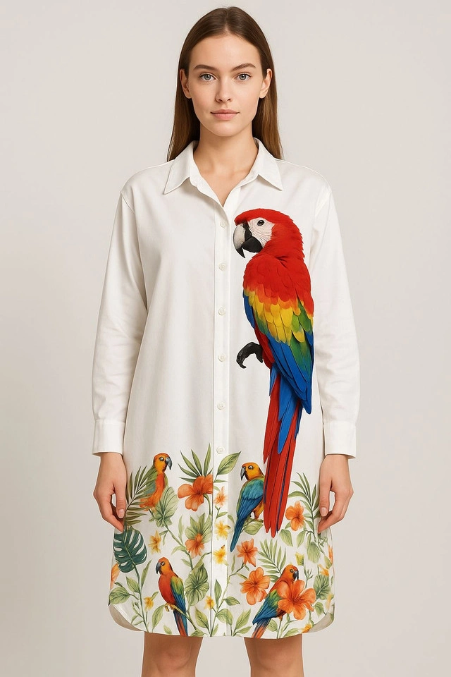 Add a touch of the tropics to your wardrobe with this new women's shirt dress, showcasing a vibrant parrot print! This eye-catching dress features a collared neckline and button-down style, perfect for a casual yet stylish look. Key Features: - Size: free size - Colour: White with multi-coloured parrot print - Material: Lightweight fabric Egyptian cotton - Style: Shirt dress with button-down front
