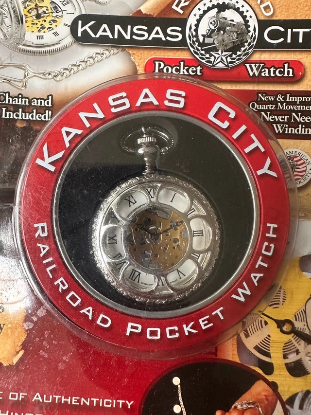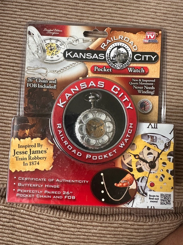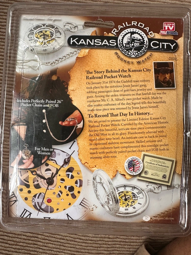 This brand new, limited edition Kansas City Railroad pocket watch is inspired by Jesse James' train robbery in 1874. It features a new and improved quartz movement that never needs winding, a 26" chain and fob, and a certificate of authenticity. It's a nostalgic piece that is perfect for men or women. This timeless piece has been appraised for $120-$150 CAD. * Inspired By Jesse James' Train Robbery In 1874 * Certificate of Authenticity * Butterfly Hinge * Perfectly Paired 26" Pocket Chain and Fob If the ad is up, it's available!