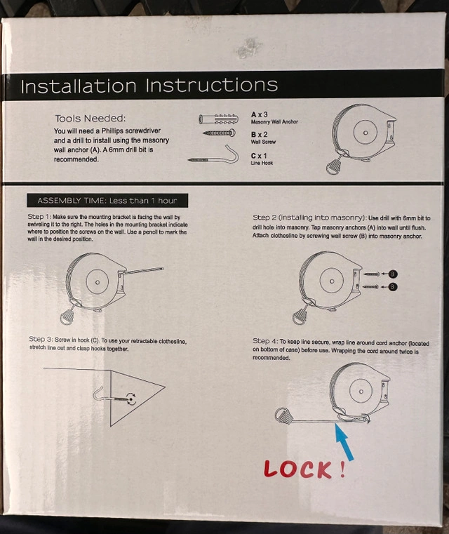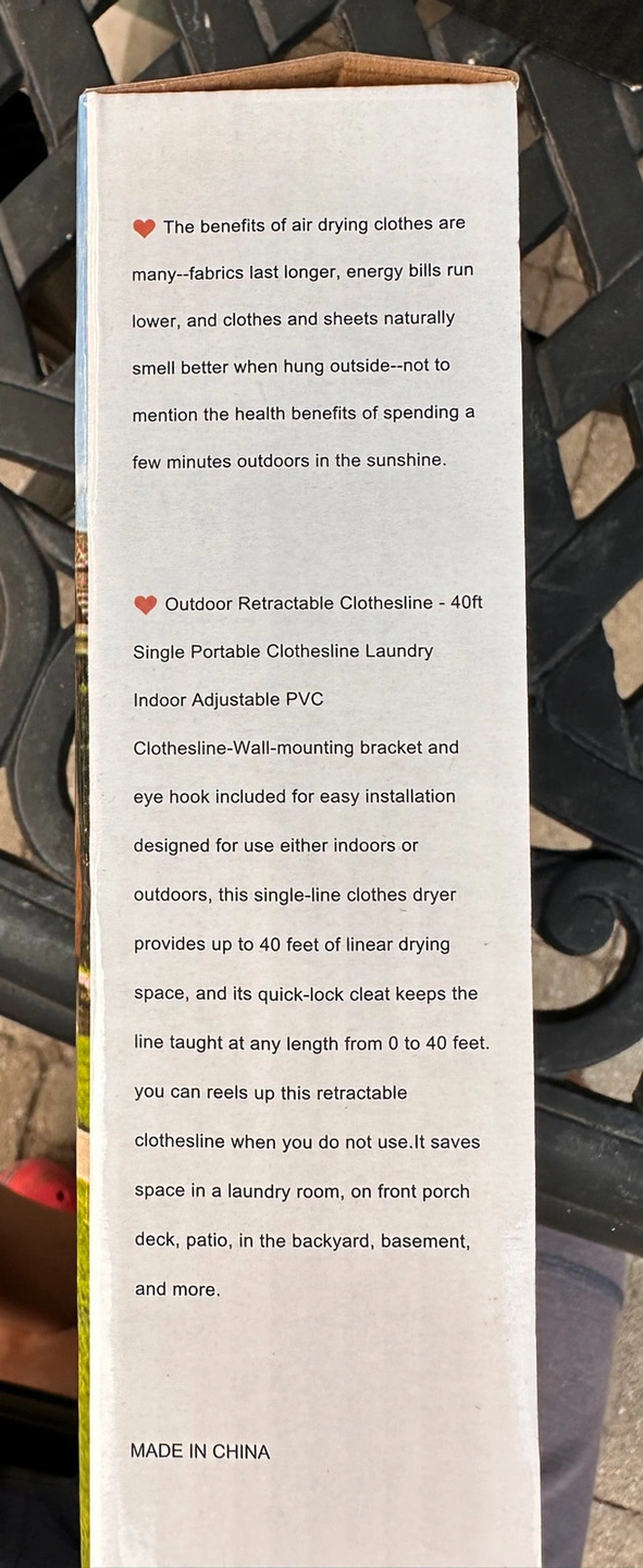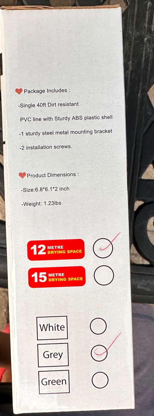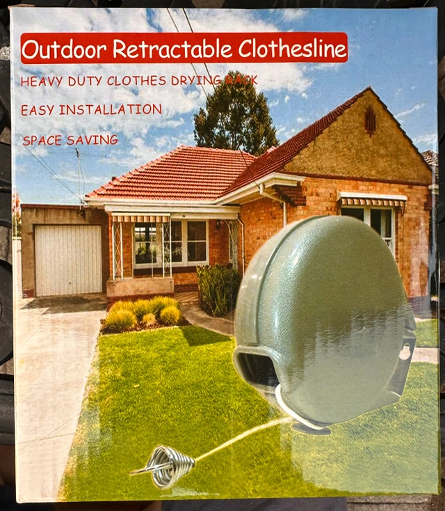 This brand new retractable clothesline is a heavy-duty, space-saving solution for drying your clothes, featuring easy installation. This unit includes a 40ft PVC line with a sturdy ABS plastic shell and a steel metal mounting bracket with screws. Here are some details: * Single 40ft dirt resistant PVC line with sturdy ABS plastic shell * Includes sturdy steel metal mounting bracket * Includes 2 installation screws * Dimensions: 6.8*6.1*2 inches * Weight: 1.23 lbs Laundry day just got an upgrade! This retractable clothesline is the bee's knees for anyone looking to save space and energy. It's like having a magic clothes-drying wand. Just pull it out when you need it and poof, it disappears when you don't! If the ad is still up, yes, it's still available!