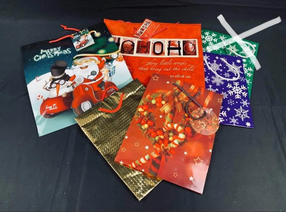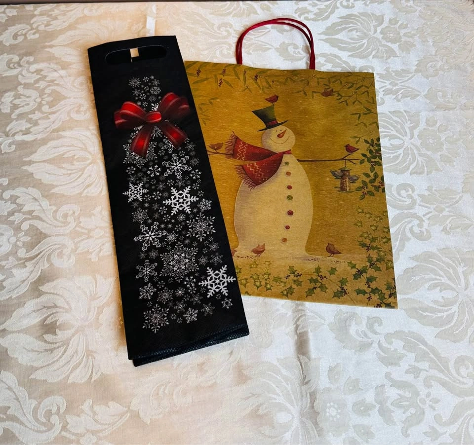 New christmas theme table table runner with cardinal and holly print. Runner is 13”x72”. Tin box is 11”x3.5”. This listing c/w various sized christmas themed gift bags.
