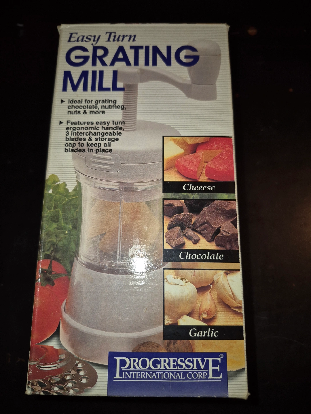 I'm selling a Progressive Easy Turn Grating Mill. It's ideal for grating chocolate, nutmeg, nuts, and more! It features an easy turn ergonomic handle, 3 interchangeable blades, and a storage cap to keep all blades in place