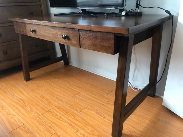 This is a used solid wood study table with one drawer, perfect for a home office or student. It's sturdy and has a classic look, though it shows signs of wear consistent with its age. Additional details: * Material: Solid Wood * Drawers: Two functional drawers with knobs * Condition: Used, with some surface wear This table is patiently waiting for its new home, adding a touch of rustic charm wherever it goes. If the ad is up, the table is available!