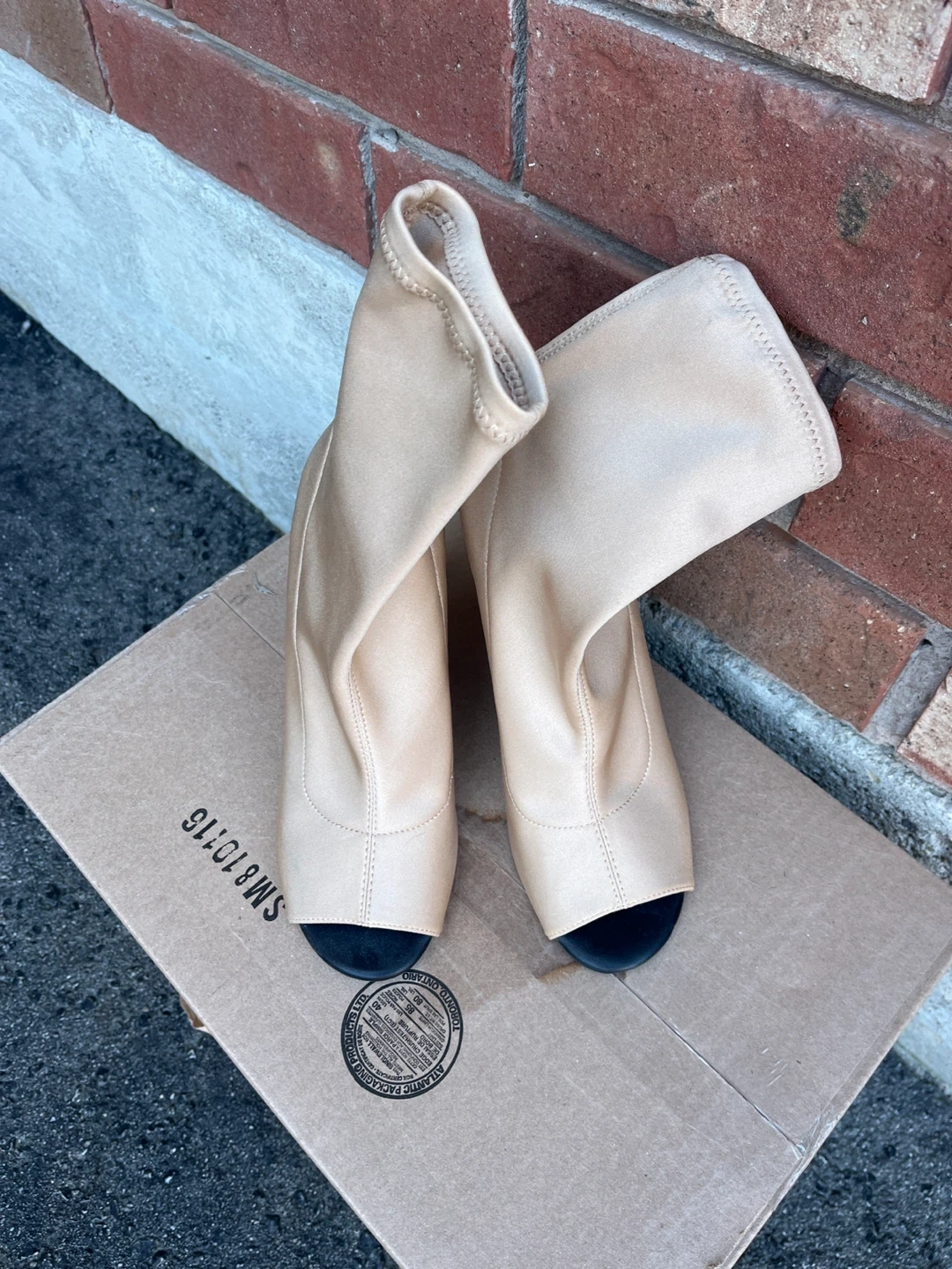 These are a pair of beige peep-toe heel booties. They're in great condition and ready for a new home! Perfect for adding a touch of style to any outfit