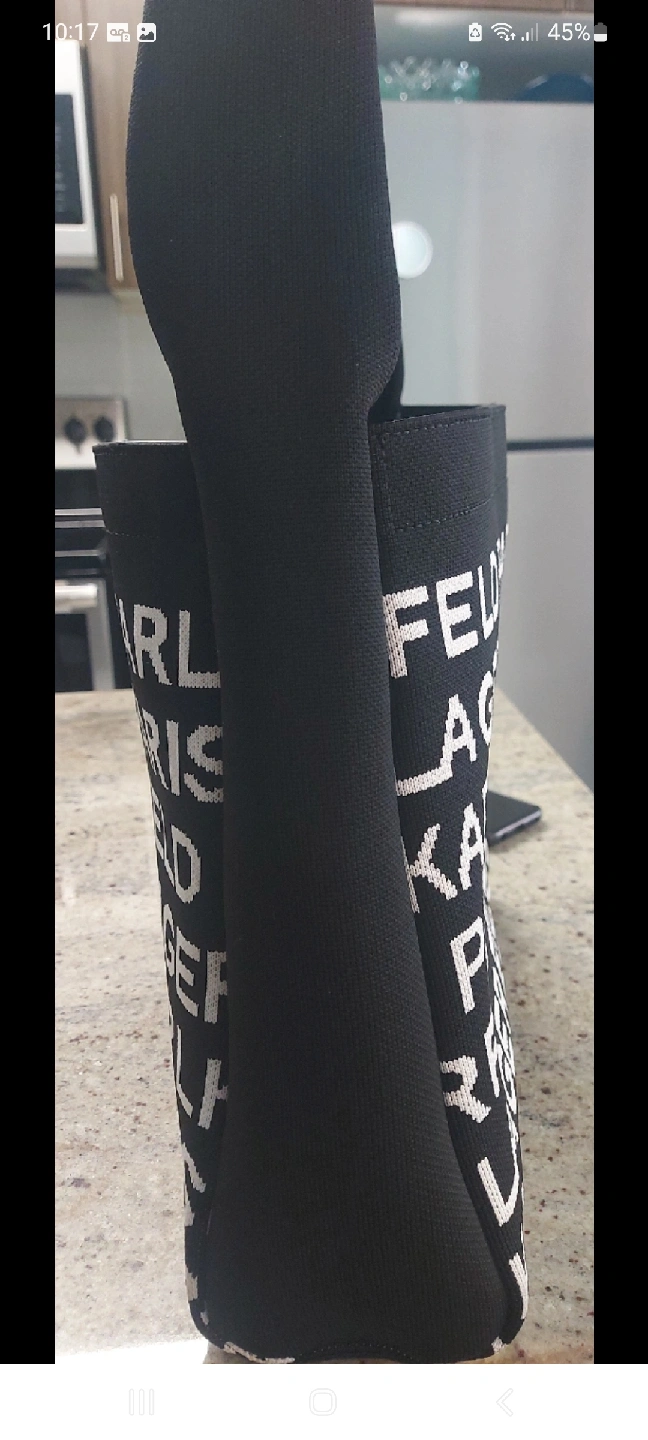 I'm selling a Karl Lagerfeld Paris tote bag in black and white. The bag features the brand name repeated in a pixelated style design. It's new and ready for a new home!