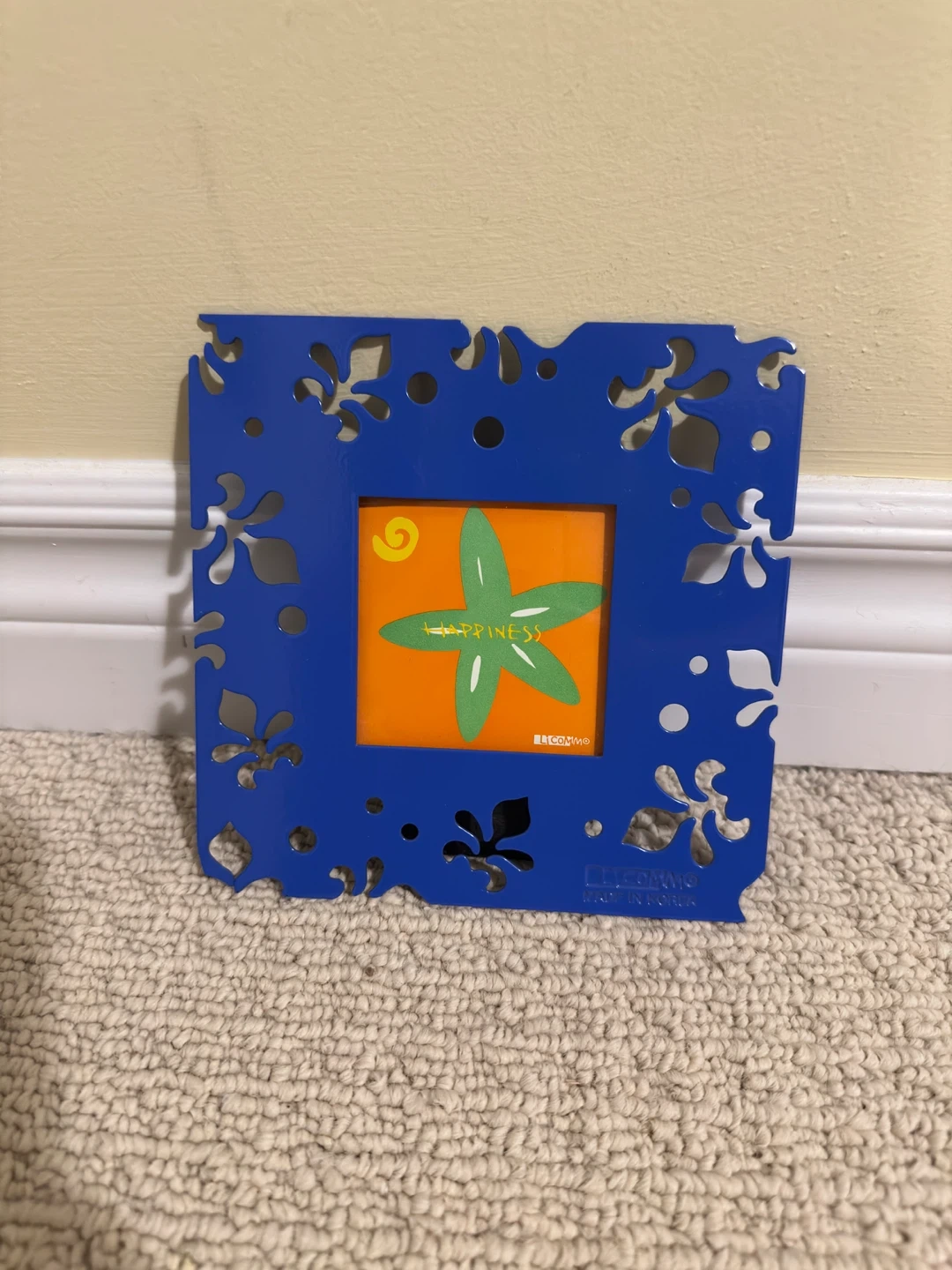 A cute Licammo picture frame! It's blue with a floral cutout design. The frame holds a small orange picture with a green starfish and the word 'Happiness'. Made in Korea