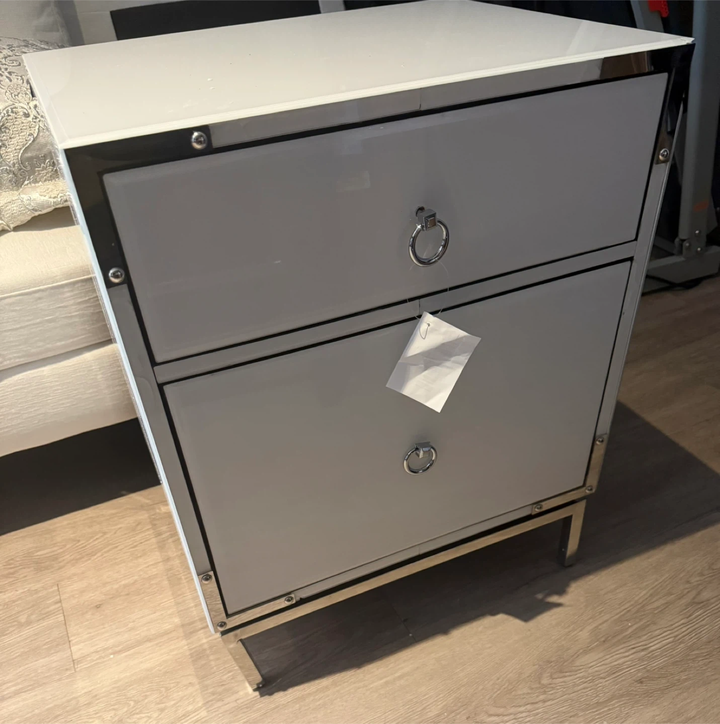 Here's a stylish white nightstand with two drawers! It's perfect for adding a touch of modern elegance to your bedroom. The chrome accents give it a sleek and polished look. It's in great condition and ready to find a new home There's some imperfections due to shipping as you can see in the pictures but it's still sturdy and beautiful