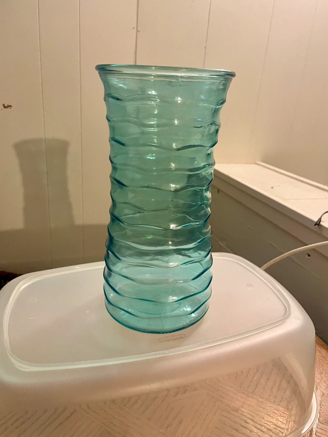 A lovely blue glass vase that would look great with any decor! It has a wavy design around the exterior. Perfect for displaying flowers or as a standalone decorative piece