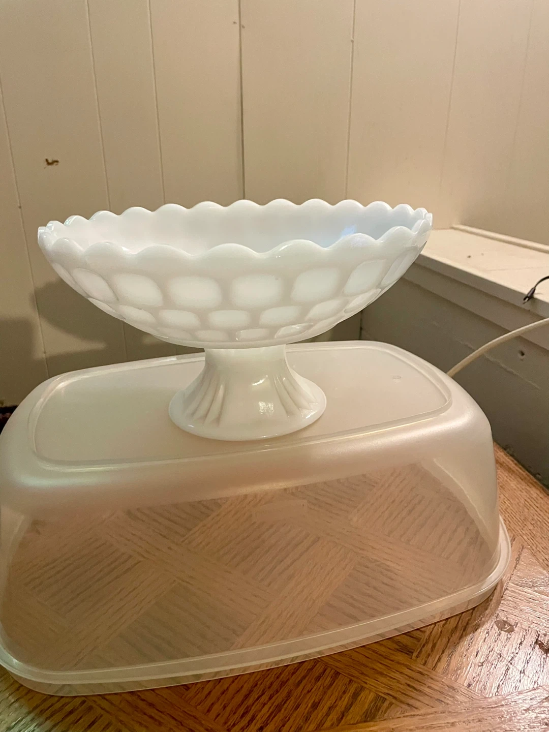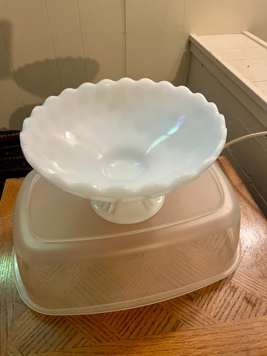 Selling a lovely vintage milk glass compote bowl. It's in great condition and would make a beautiful addition to any table or display! The bowl has a delicate, scalloped edge and a classic pedestal base. Perfect for serving fruit, desserts, or using as a decorative piece