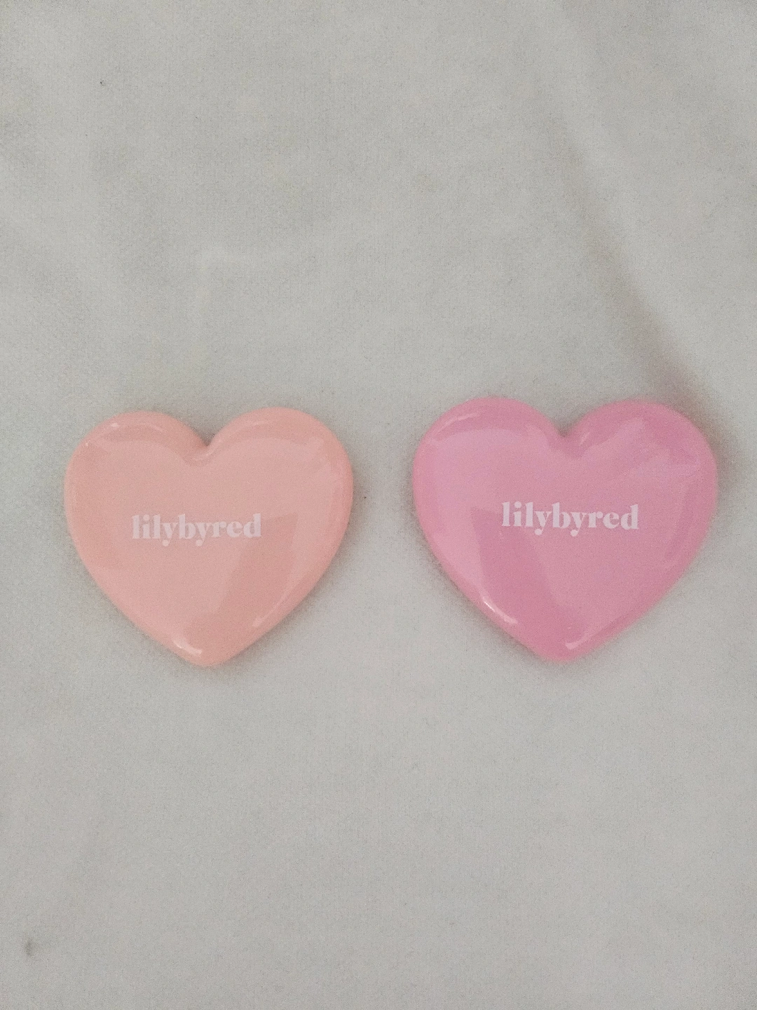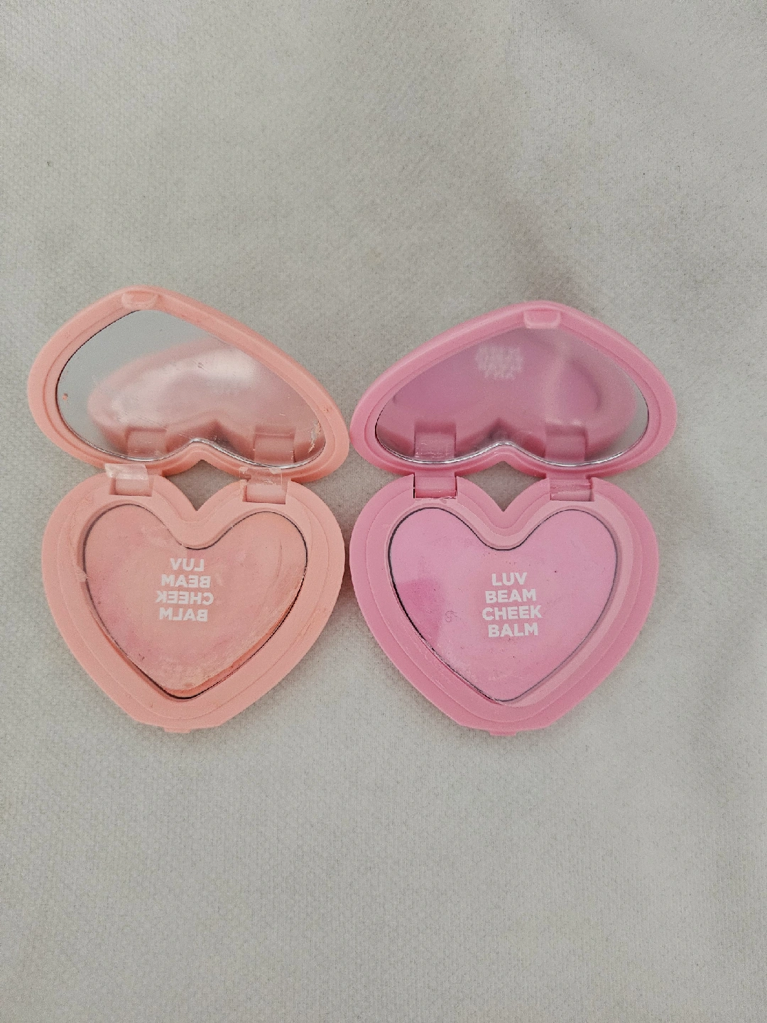 💖💖Selling two Lilybyred Luv Beam Cheek Balm blushes. They are heart-shaped and come in two shades of pink. One is a lighter, peachier pink, and the other is a deeper, rosy pink. Perfect for adding a touch of colour to your cheeks!