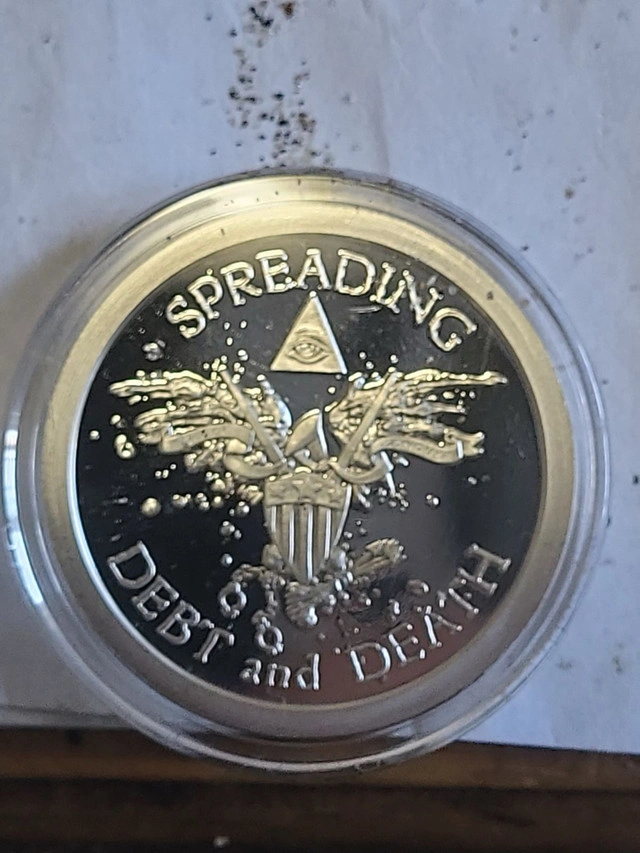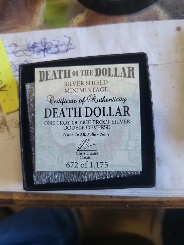The 1oz Death Dollar Double Obverse Proof Death of the Dollar Silver Shield is a stunning addition to any coin collection. This round silver coin, made in the United States by Golden State Mint, has a fineness of 0.999 and weighs 1 oz. The double obverse design adds a unique touch to the coin, making it a must-have for collectors. With its intricate design and high-quality silver content, this coin is sure to impress. The Death of the Dollar design is a powerful statement piece that reflects the current state of the world's economy. This coin is a great investment for those looking to diversify their portfolio with precious metals. Condition: New More Info: Other For Sale By: Owner Curbside pick up: Yes Cash accepted: Yes