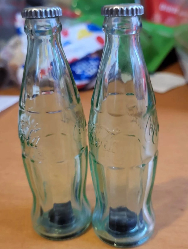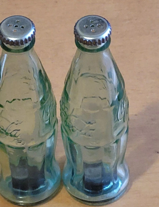 Add a touch of retro charm to your dining table with these Coca-Cola embossed mini green glass bottle salt and pepper shakers! Made in China, these reproduction shakers feature metal tops and are designed to resemble classic Coke bottles from 1998. The green color and soda theme make them a perfect addition to any collection of Coca-Cola memorabilia or soda-themed decor. Each shaker measures approximately 3.5 inches tall and is a great size for seasoning your favorite dishes. Whether you're a collector or just looking for a unique set of shakers, these Coca-Cola embossed mini green glass bottle shakers will add a pop of color and nostalgia to your home. Condition: Used - Like new More Info: Pop Culture Collectibles For Sale By: Owner Curbside pick up: Yes Cashless payment: Yes Cash accepted: Yes