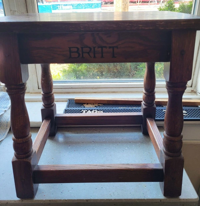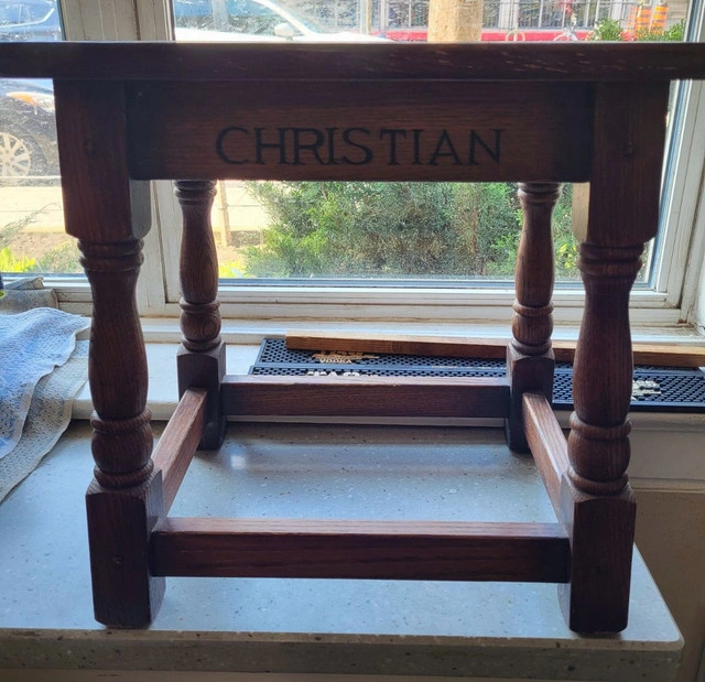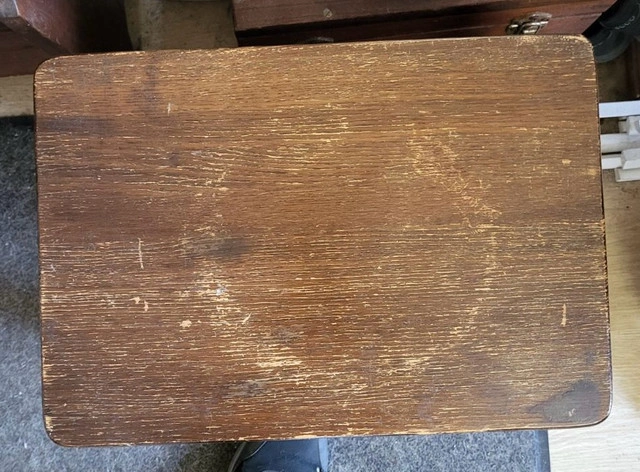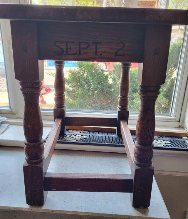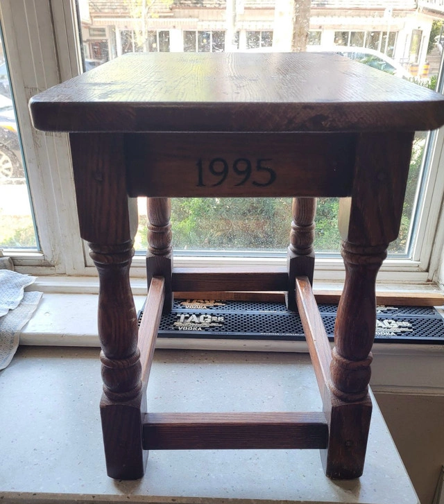 Solid wood wedding stool in good condition. The top is worn (see photo) but without cracks or deep scratches.