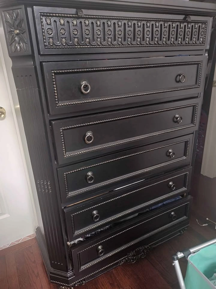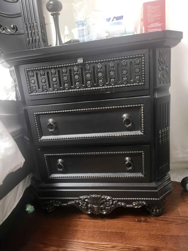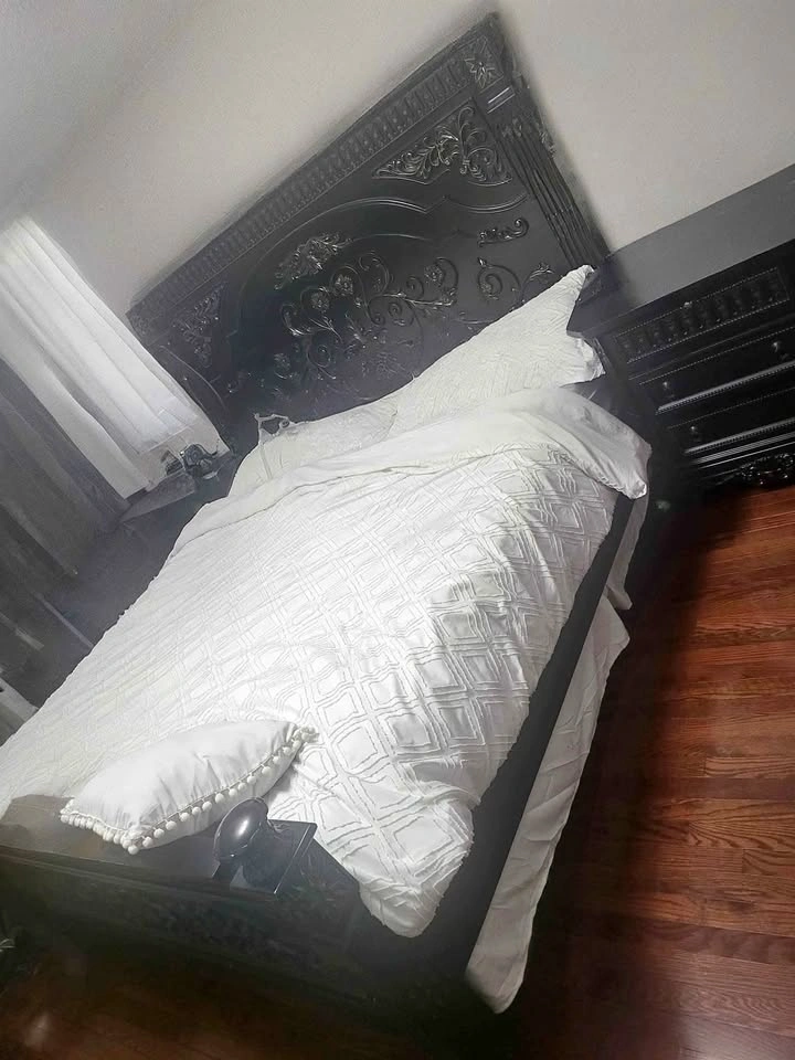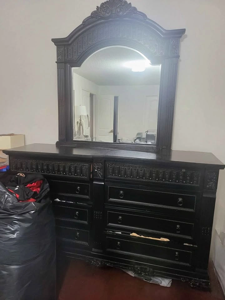 King sized bed frame with headboard, footboard and sides ($500). From Ashley furniture. 2 Side tables ($200 each) Tall chest ($200) Dresser with mirror ($300) ****no mattress*****( Immaculate condition. Moving sale! Total bedroom set $1200 OBO. Ashley price is over $2k.