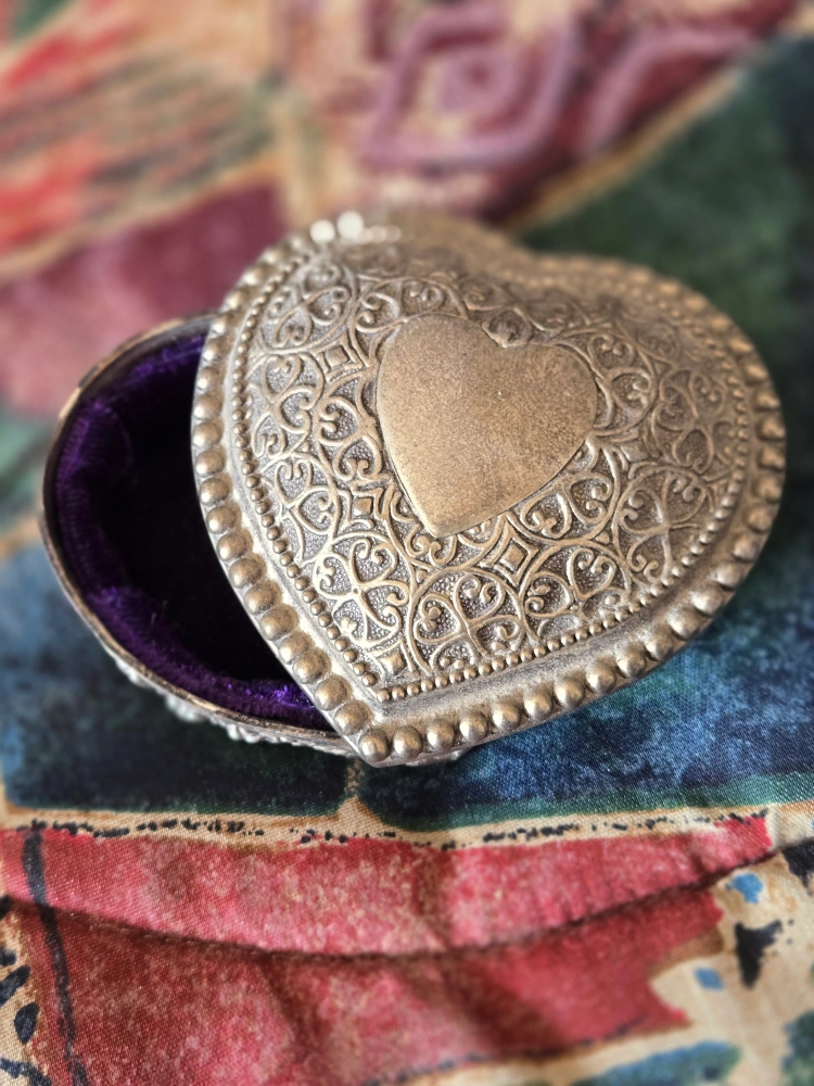 Selling a lovely silver heart-shaped trinket box. It's perfect for storing small jewelry or keepsakes. The box has a detailed, ornate design on the lid and a soft, purple velvet lining inside. It's in great condition and ready for a new home!