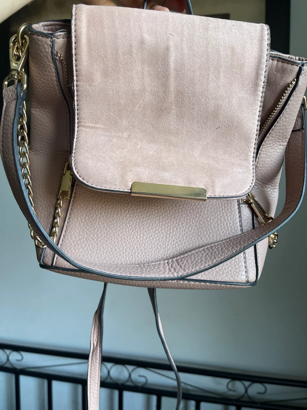 A cute light pink backpack purse with gold hardware detailing! Great for carrying your essentials while keeping your hands free