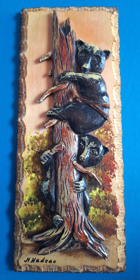 This is a hand crafted wall art piece featuring bears climbing a tree. It's crafted in Canada and signed by Henry Nadeau, Canadian folk art artist. Vintage 1970s. 10 x 4 inches