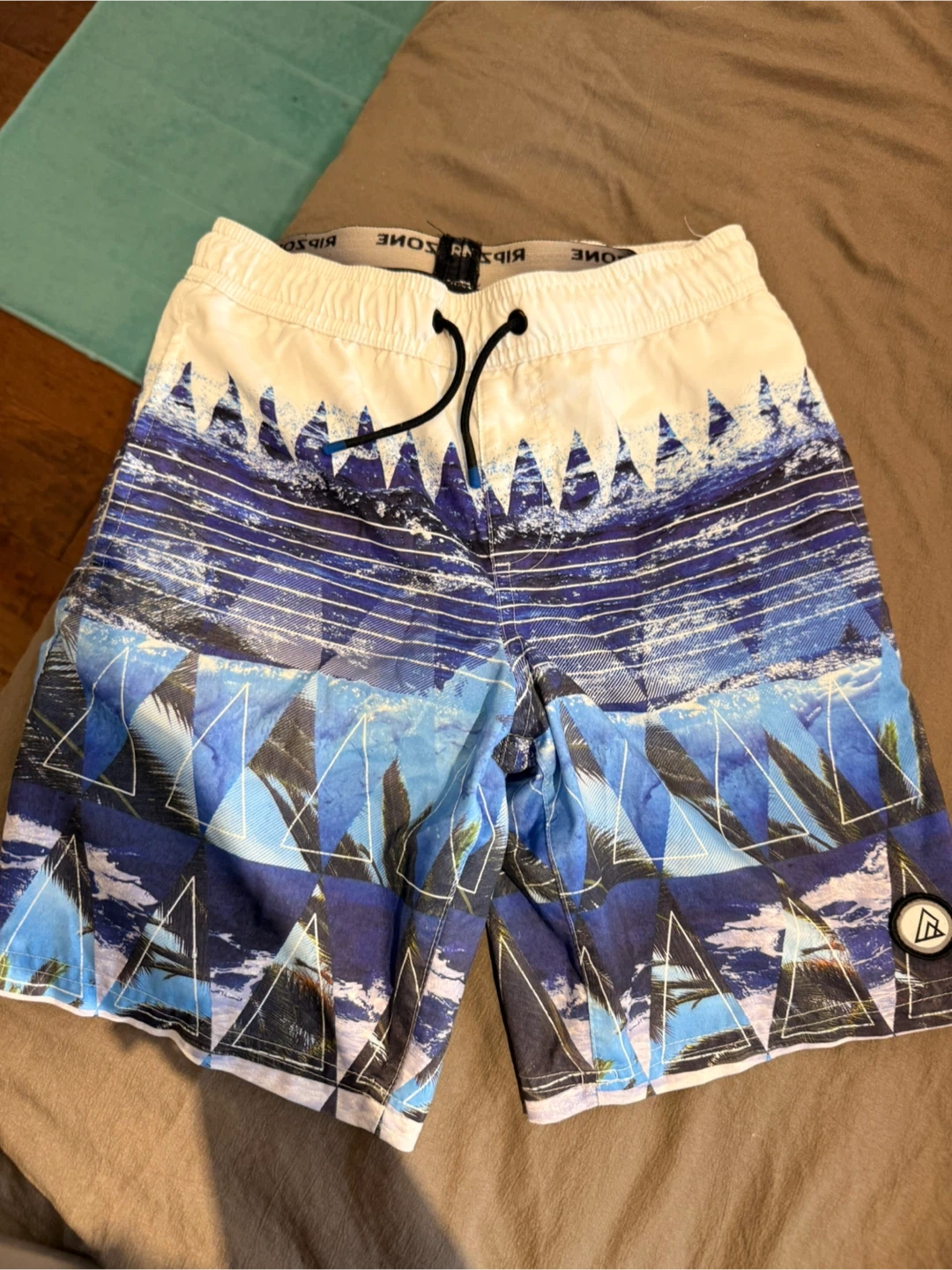 Ripzone swim trunks in size M/M! They feature a cool blue geometric pattern and a comfortable fit. Perfect for the beach or pool!