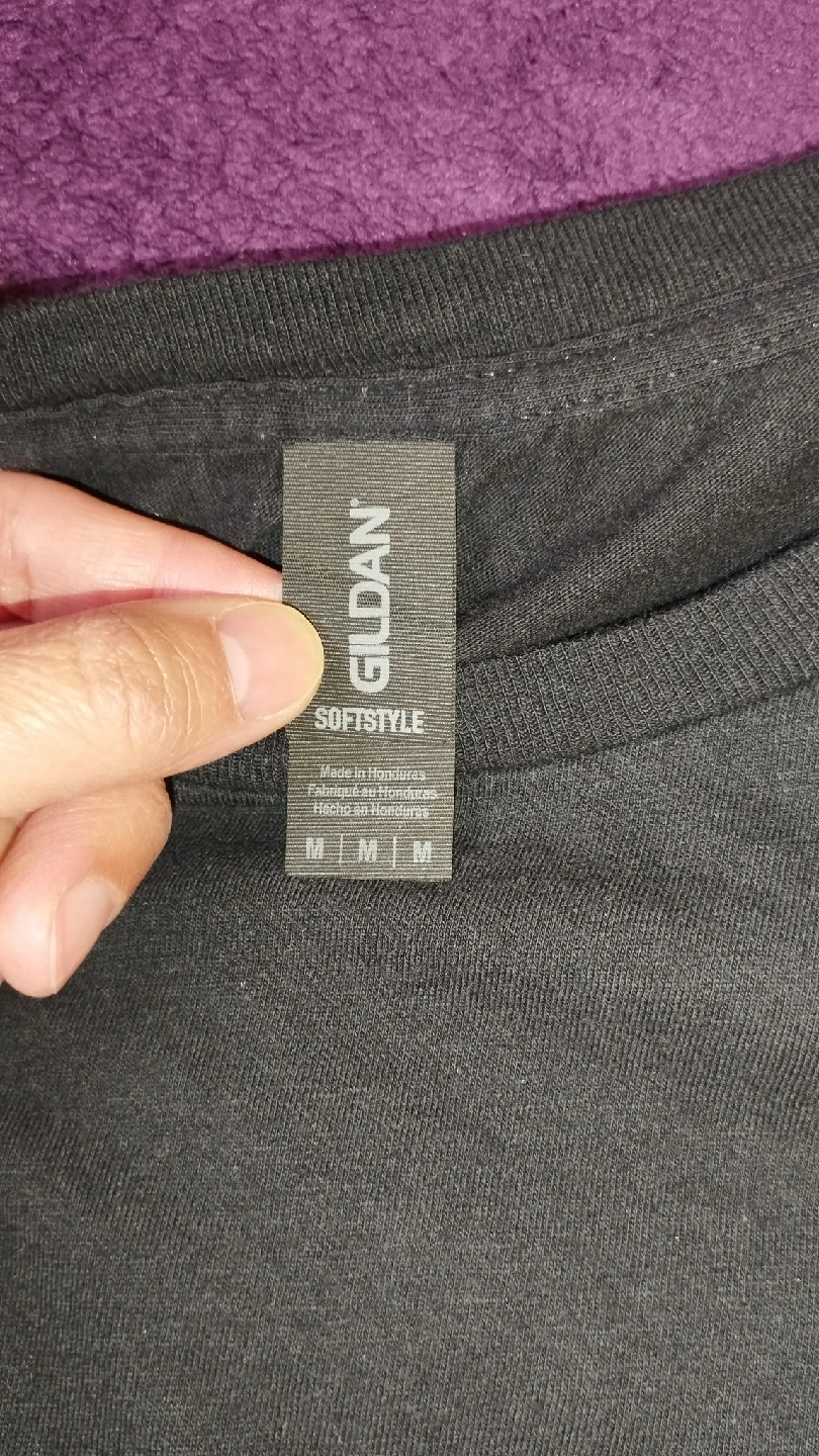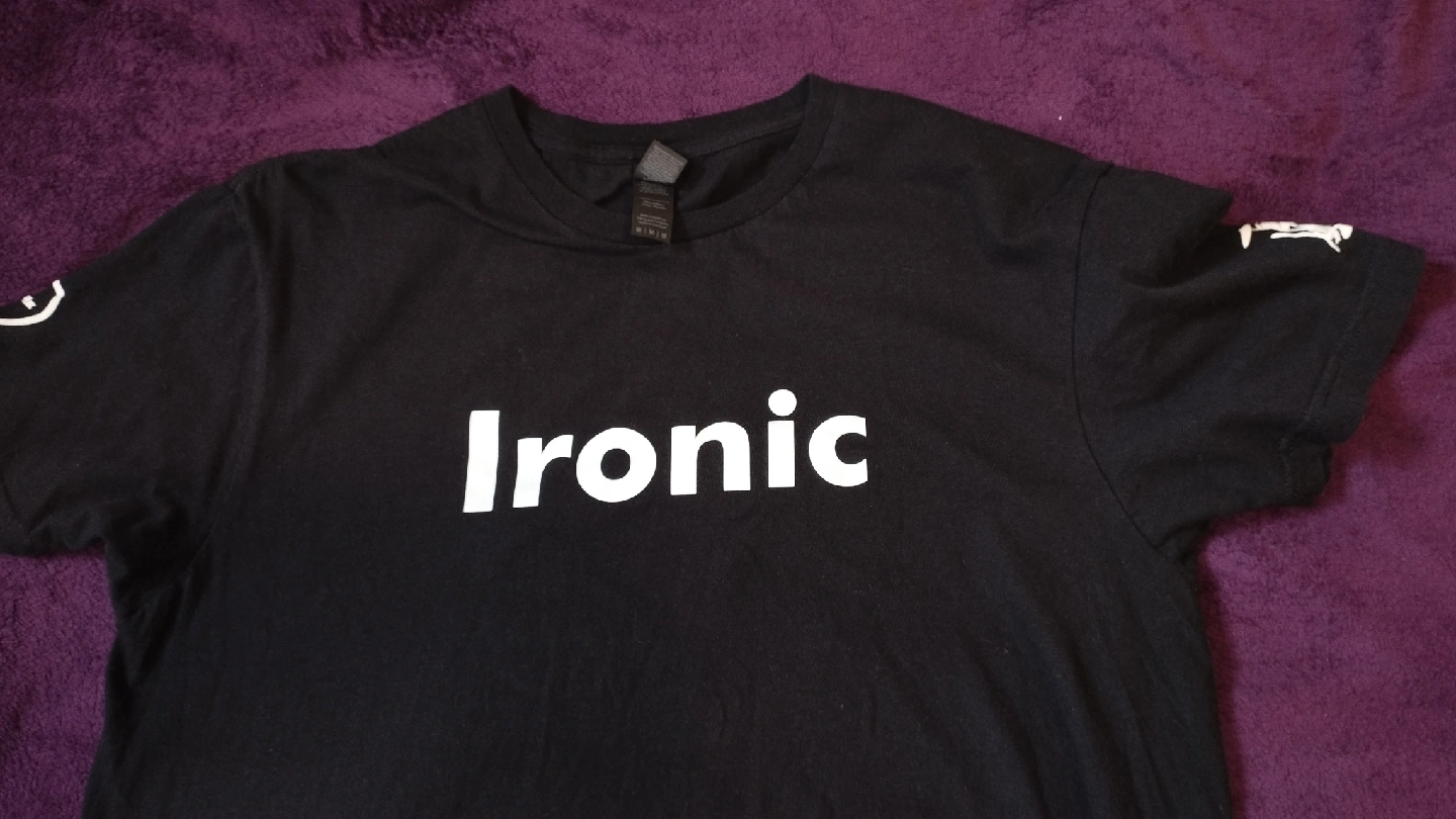 Selling a Gildan Softstyle black t-shirt with the word "Ironic" on the front and a graphic on the back. The size is medium. It's in great shape and ready for a new home!