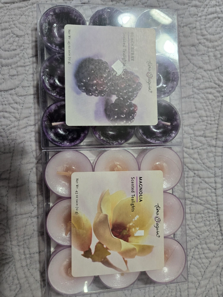 Selling two packs of scented tealights from Time Bagain! One is blackberry scented and the other is magnolia scented. Each tealight is .43 oz (12g).
