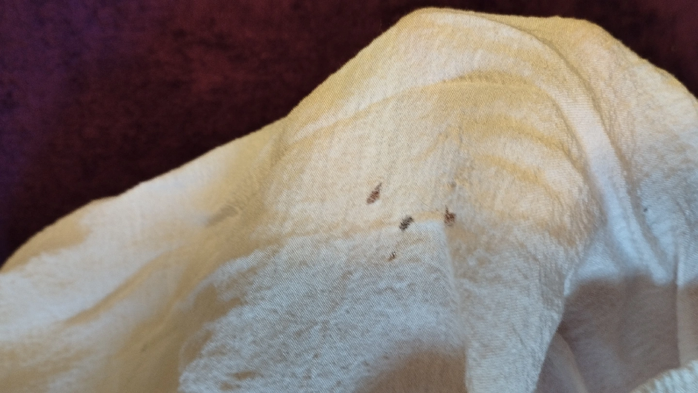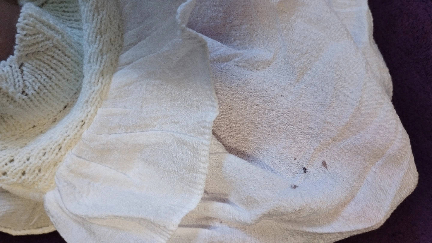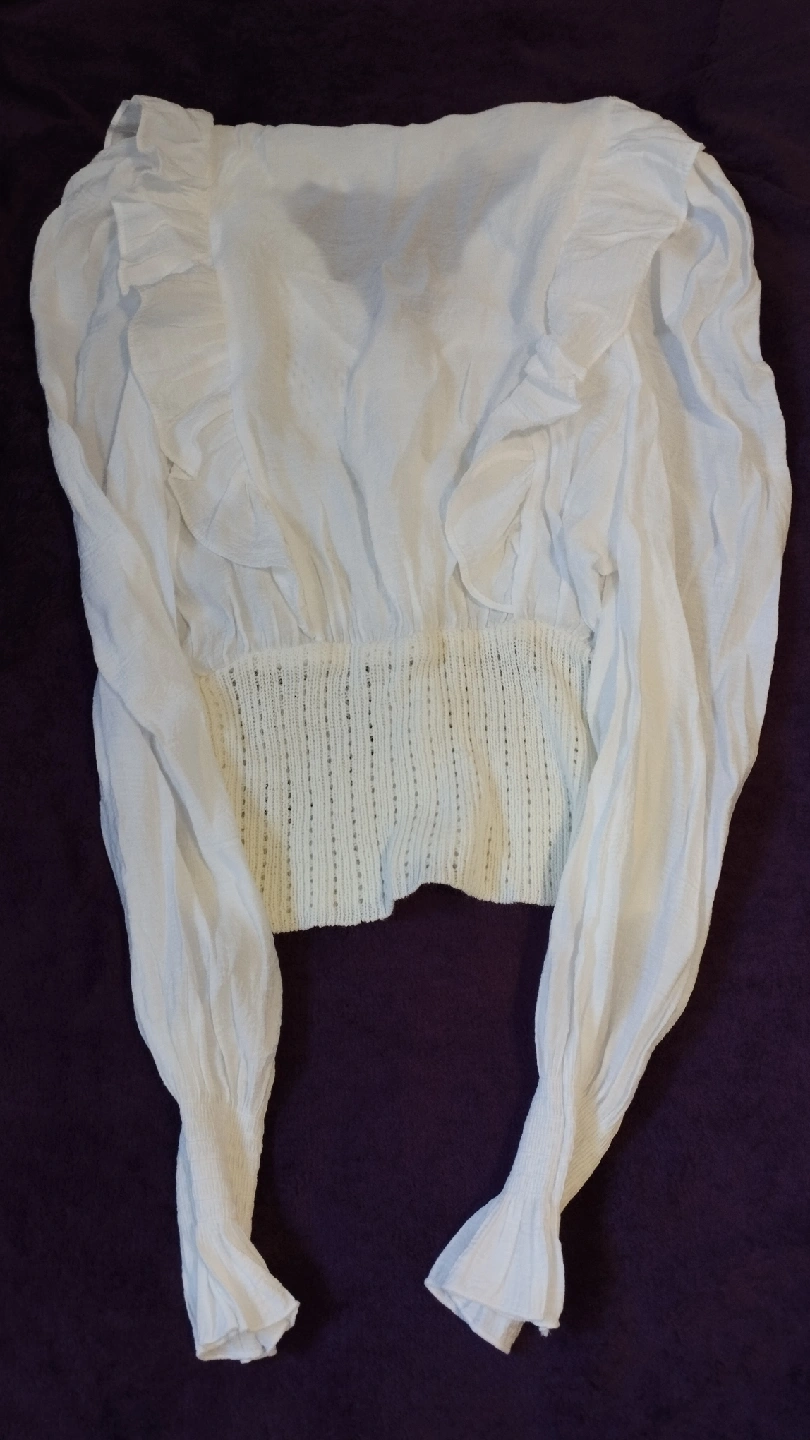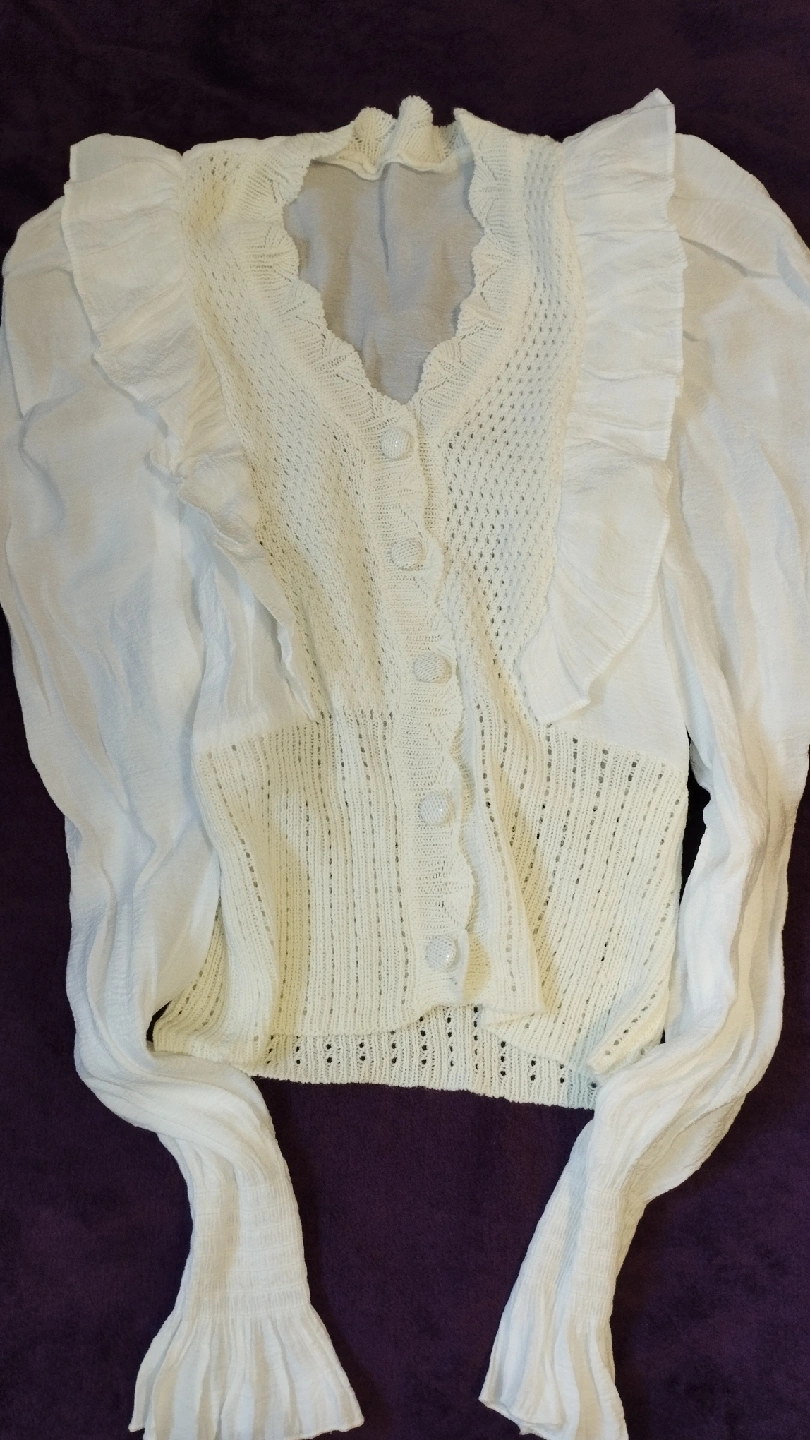 A cute white blouse with ruffle detailing! It has a button-up front with a knit section and long sleeves. There are some small stains on the fabric, as shown in the photos, but otherwise it's in good condition