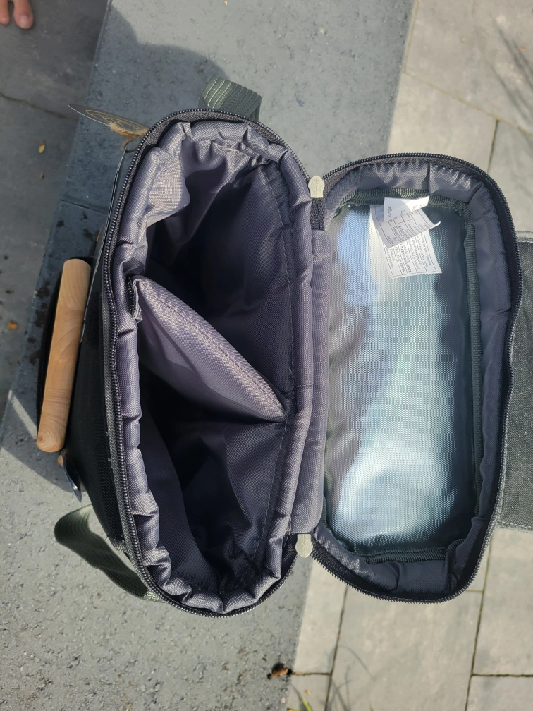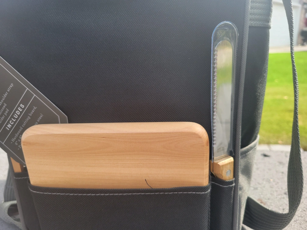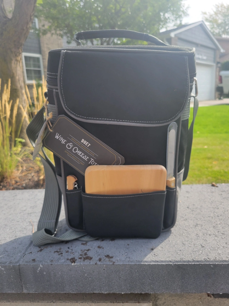 I'm selling a brand new Picnic Time Duet Wine & Cheese Tote! It's perfect for picnics and outings. It includes a hardwood cutting board and a stainless steel cheese knife. The tote features a shoulder strap for easy carrying.