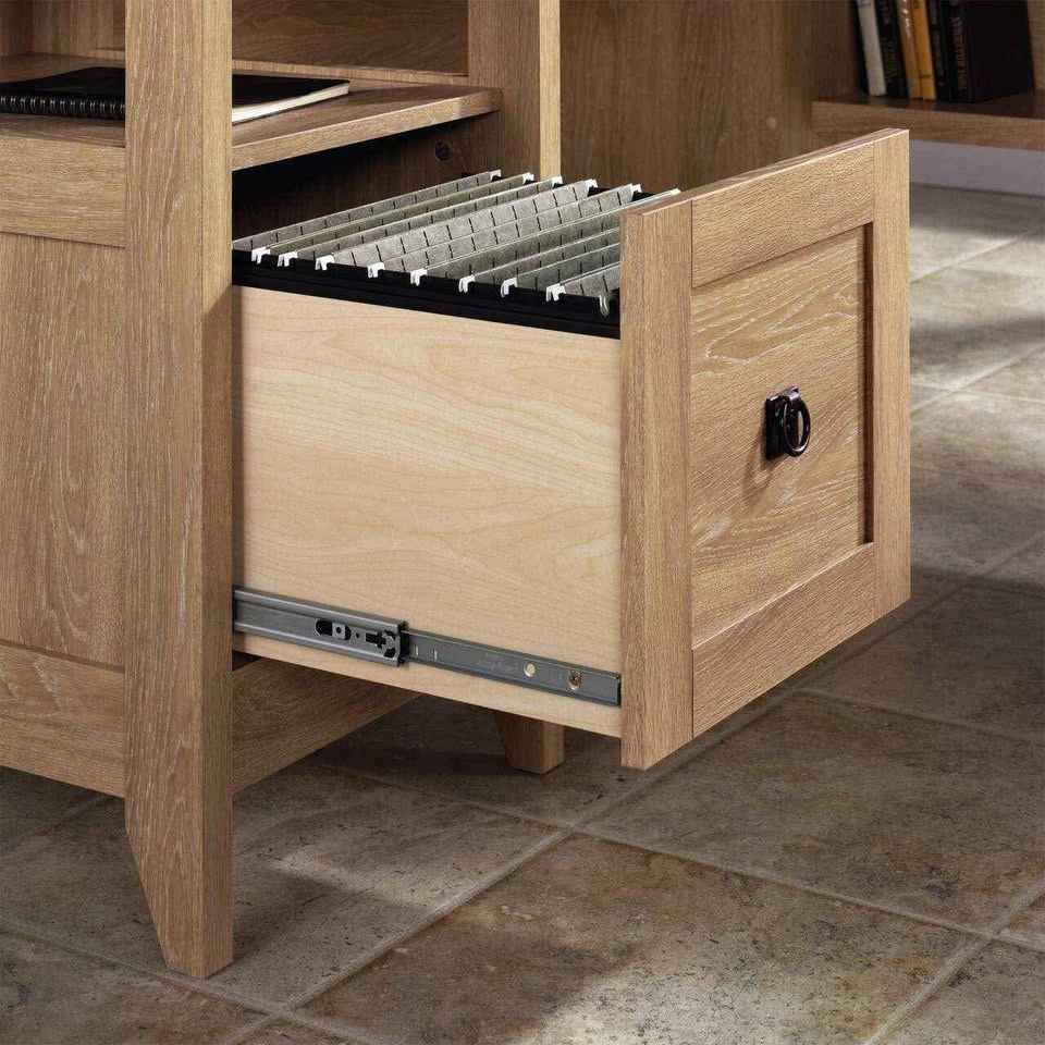 Brand new Sauder 412320 August Hill corner L-shaped desk. It comes unassembled in the original sealed, never-opened box with all manufacturer parts, hardware, and instructions for easy assembly. Retails at Amazon for $570 + tax. Save your money! Product details: Brand: Sauder Shape: L-Shape Desk design: Executive Desk Product Dimensions: 149.23W x 149.86L x 74.3H Centimetres Weight: 57.61 kg, 126.9 pounds Colour: Oak Style: Traditional File drawer with full extension slides holds letter-size hanging files Grommet holes and pass-throughs for cord management Lower shelf for additional storage Dover Oak finish with Slate finish accents Engineered wood construction Assembled dimensions: L: 59.06" x W: 58.74" x H: 29.25"