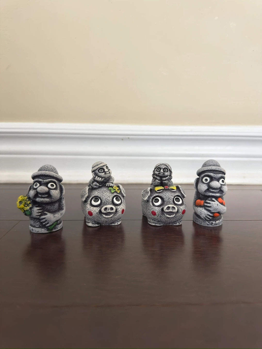 Selling a set of four cute Jeju Island figurines! Two are stone grandfathers holding flowers and two are pig figurines with stone grandfathers riding them. These are great for decoration or as a souvenir