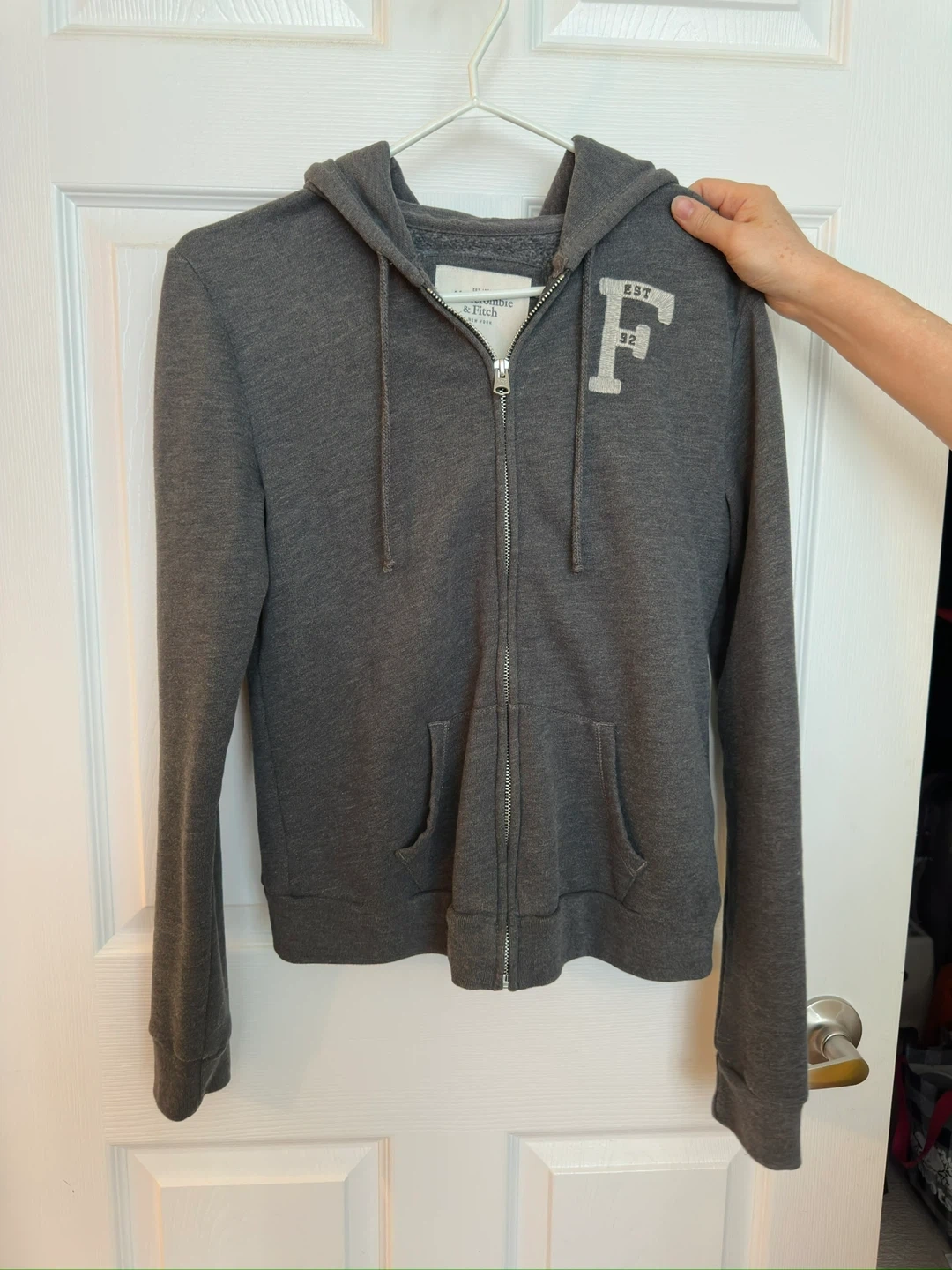 Selling a gently used Abercrombie & Fitch zip-up hoodie in a nice grey colour. It features the 'EST F 92' design on the front. Perfect for layering or just lounging around the house!
