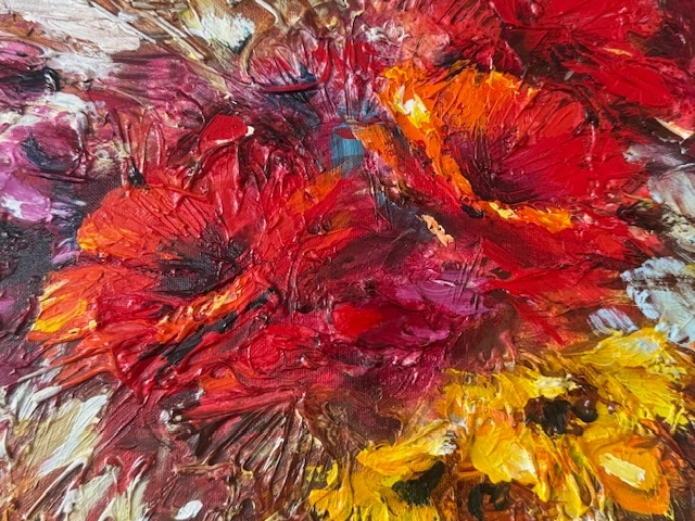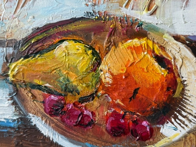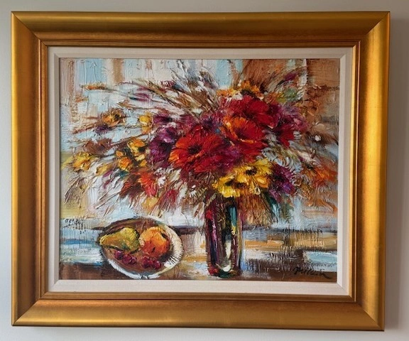 "Vibrant Still Life with Flowers & Fruit" - 34" x 40" This magnificent original oil painting showcases the masterful work of Michael Milkin (b. 1964), a celebrated Ukrainian-born artist now based in Israel. Known for his dramatic, thick brushwork and brilliant color palette, Milkin has developed his own unique technique that brings incredible life and energy to his subjects. โจ HIGHLIGHTS: Large impressive size: 34" x 40" Original oil on canvas - not a print! Professionally framed in elegant gold frame Vibrant still life featuring lush flowers and fresh fruit Signature expressive brushwork with rich, textured paint application Museum-quality piece from an internationally exhibited artist ๐ ABOUT THE ARTIST: Michael Milkin is a member of the National Artist Union and has exhibited throughout Ukraine, France, Germany, Israel, and the United States. His architectural background brings sophisticated composition to his passionate, expressive painting style. Perfect for: Art collectors seeking original works Interior designers looking for statement pieces Anyone who appreciates vibrant, professionally executed fine art This is a rare opportunity to own an original work by an artist whose paintings are collected internationally. The piece would make a stunning focal point in any home or office.