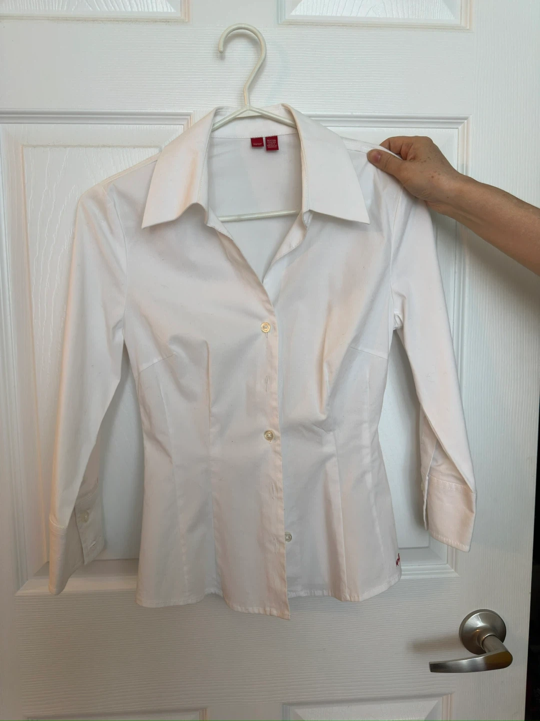 A crisp white Esprit blouse, perfect for work or a smart casual look! It's a fitted style with long sleeves. The material feels nice and comfortable, and it's in great condition.