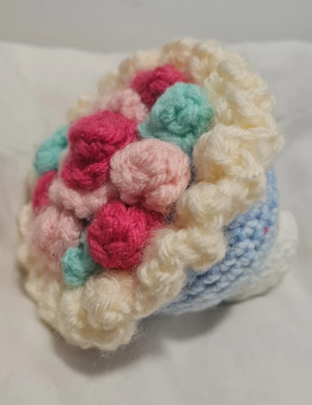a cute, customizable bouquet of crochet flowers, about the size of your palm.