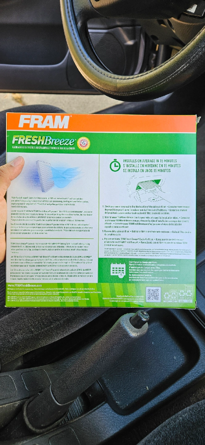 Selling a FRAM Fresh Breeze cabin air filter for Honda vehicles. This filter cleans and freshens the air with activated carbon, providing 2 years of protection. It's designed for easy installation in about 15 minutes. The model number is CF10135.