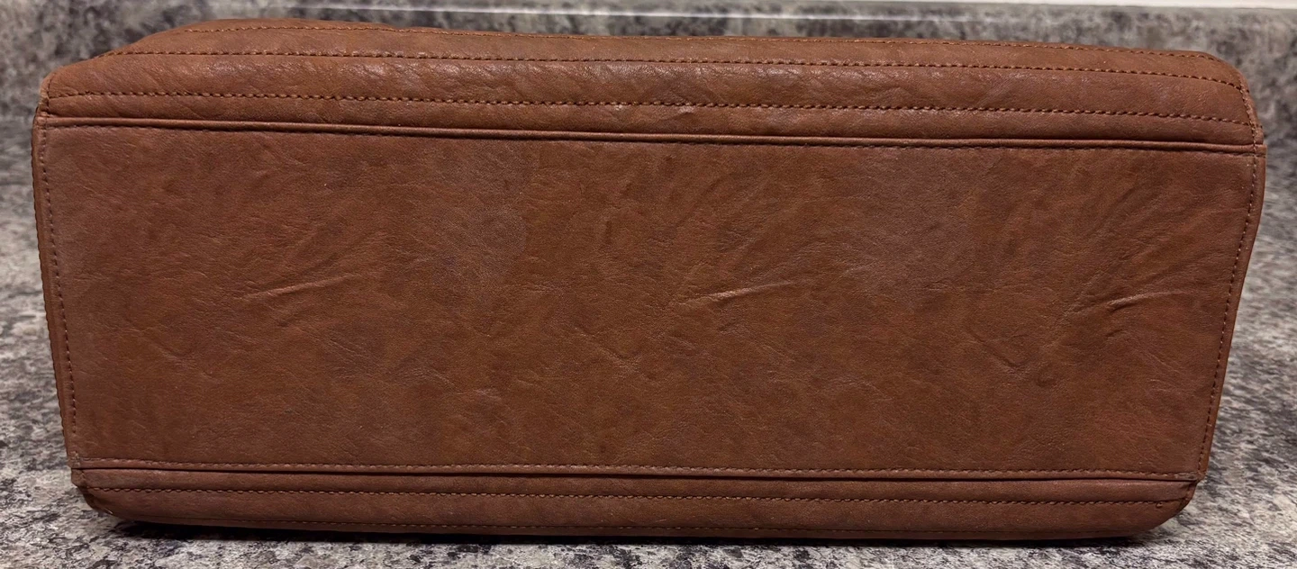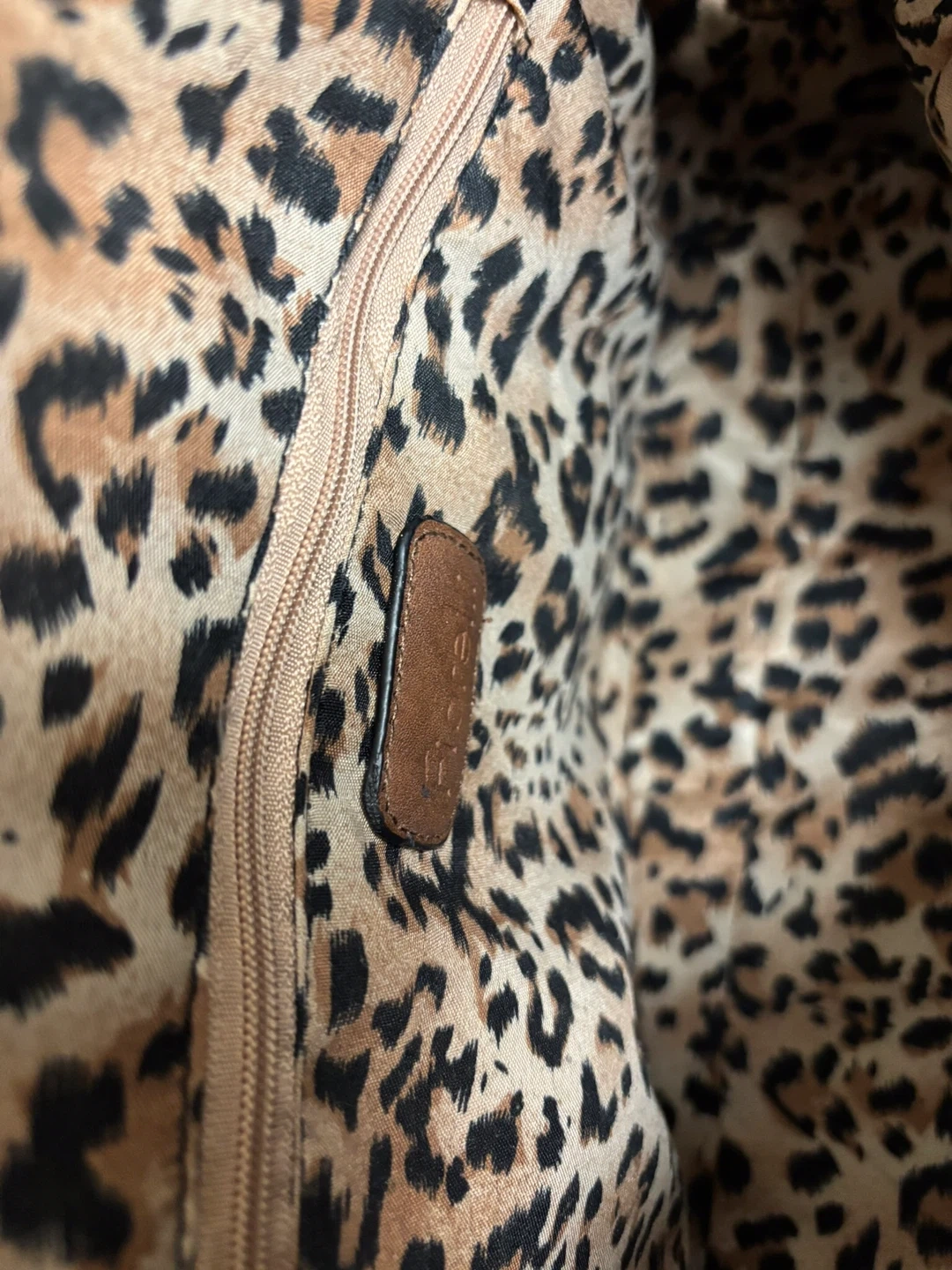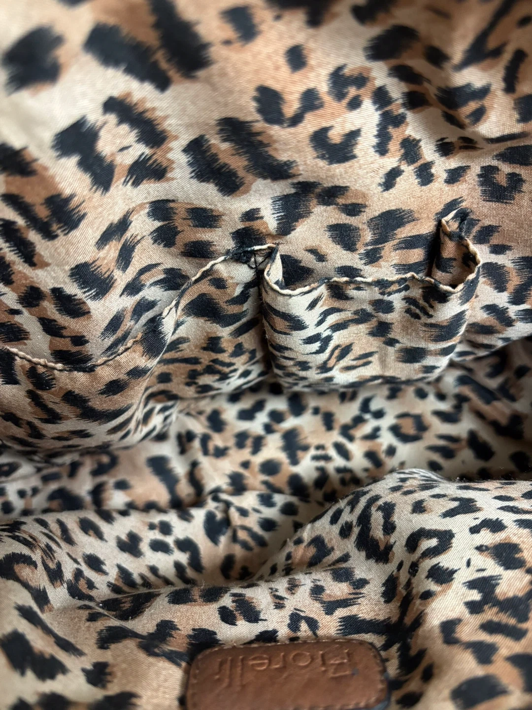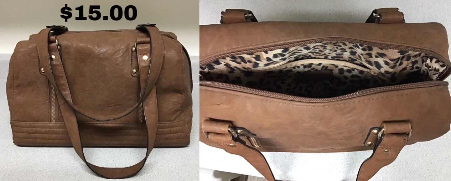 Selling a brown faux leather satchel bag. It's in good condition and features a zipper closure and an interior with a fun leopard print lining. It's perfect for everyday use! $10.00 exact cash only As is, more info in photo 2 open pockets, 1 zippered Different pictures to show all of purse, by utensils to show size