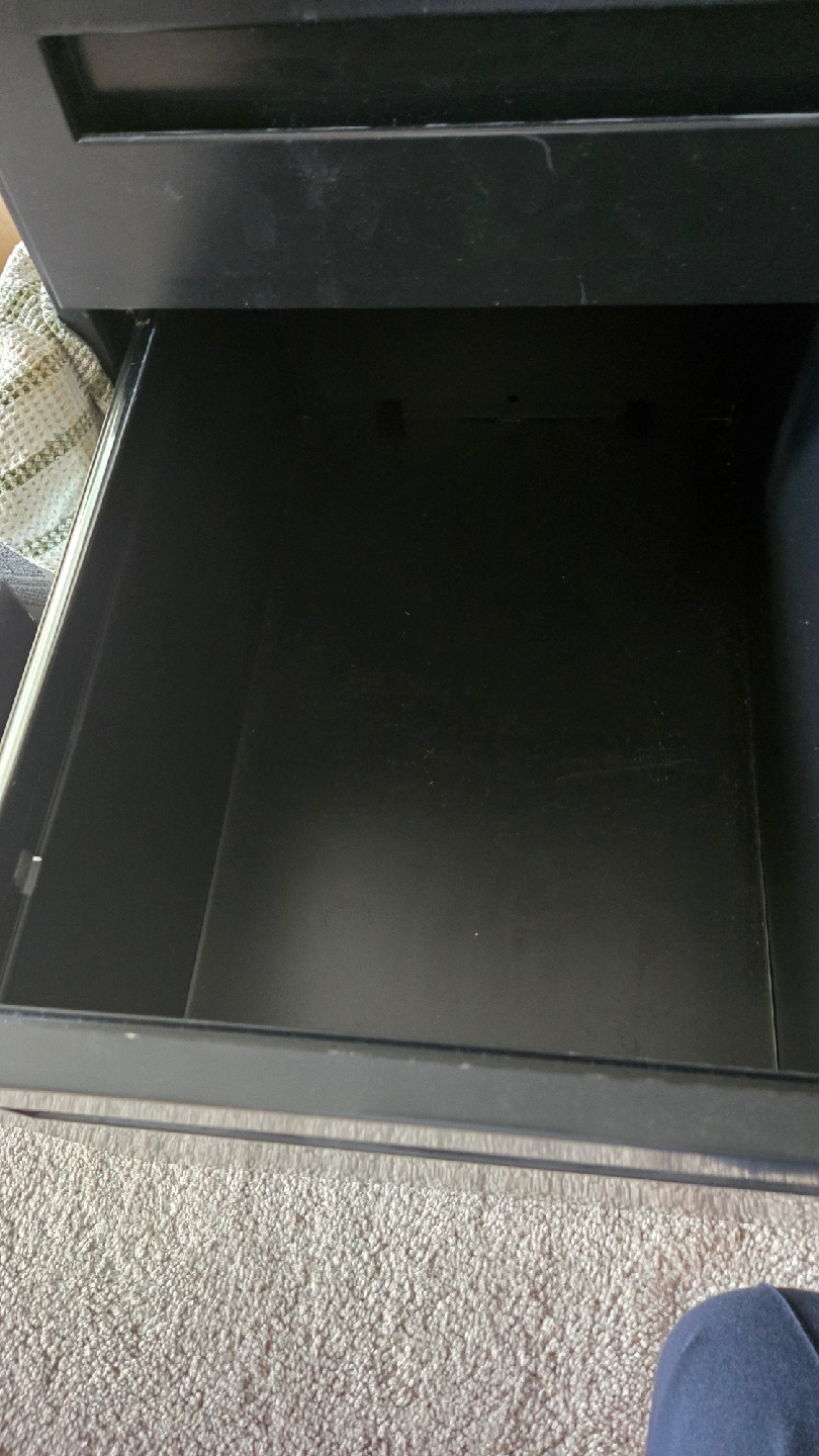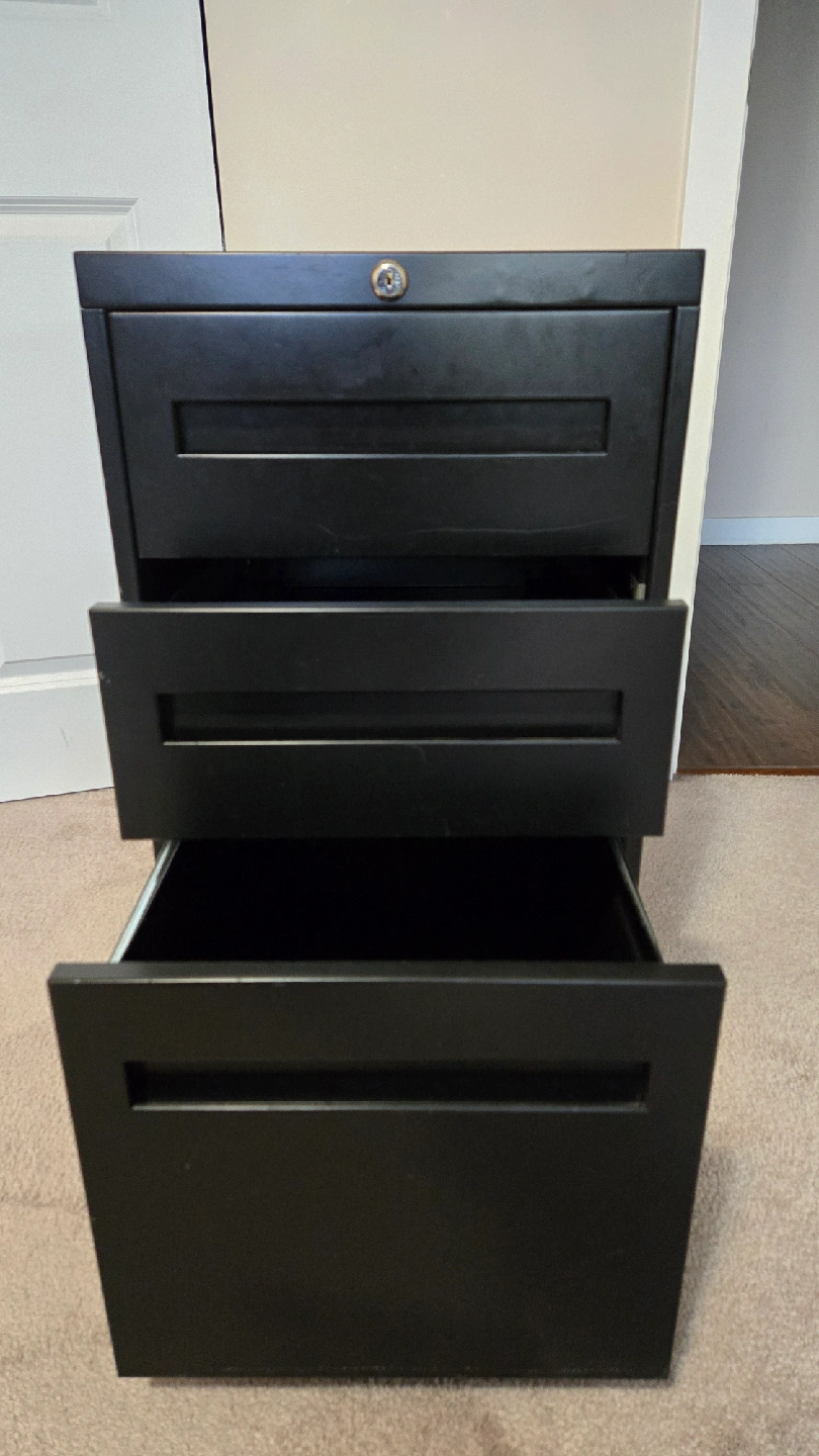 Selling a black filing cabinet with three drawers. It's in great shape and ready to help you organize your documents. Perfect for a home office or small business! Key included.