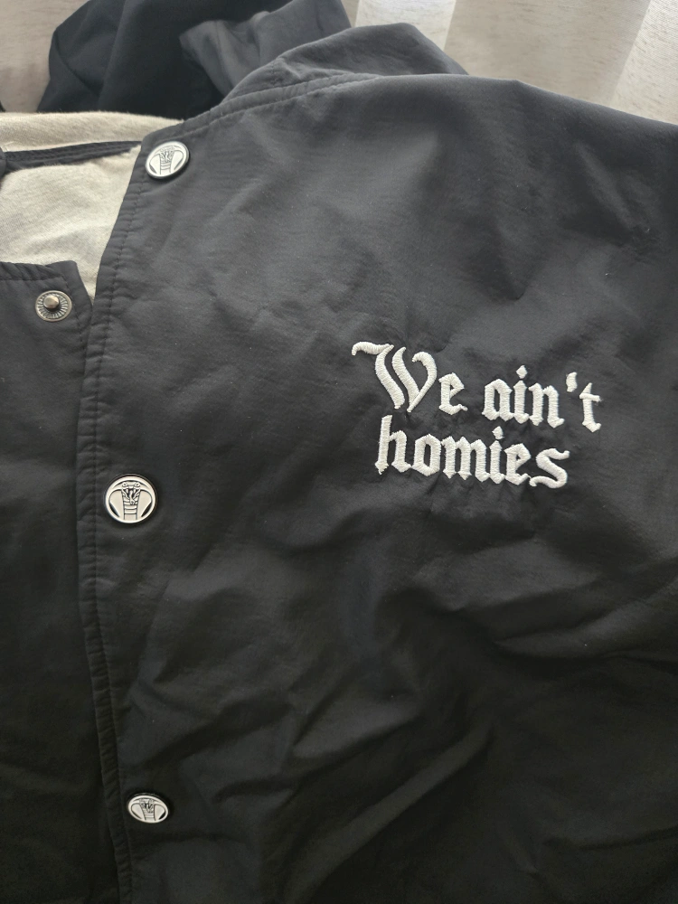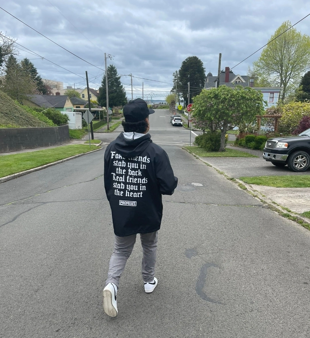 Black rain jacket from Zumies by Broken Promises from the "We ain't Homies" collection. Great condition, no flaws, just grew out of the style. Size X-Large Back says "Fake friends stab you in the back. Real friends stab you in the heart.'