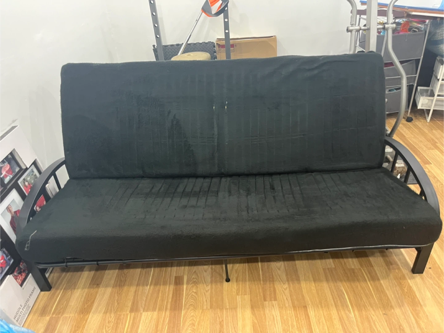 Selling a black futon frame and mattress. The mattress has a small tear, as shown in the picture, but otherwise it's in good condition. The frame is sturdy and easy to assemble. Great for a spare room or basement! MUST PICK UP