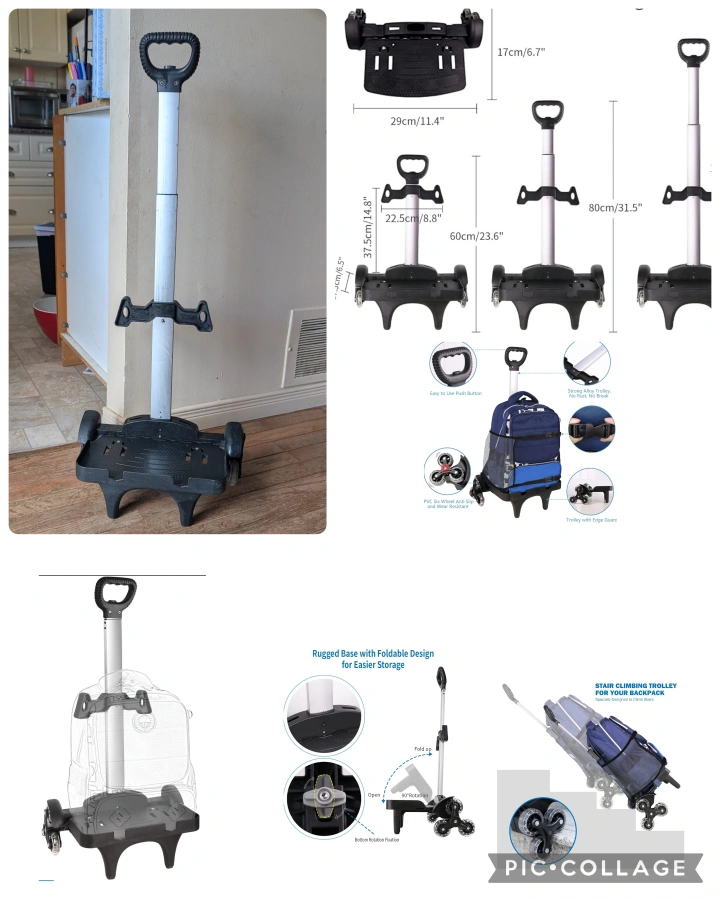 This stair climbing trolley is designed for your backpack, making it easier to carry heavy loads up stairs. It features a rugged base with a foldable design for easier storage. The trolley has six PC wheels and a strong alloy trolley that is no break. The height is adjustable up to 80cm/31.5".