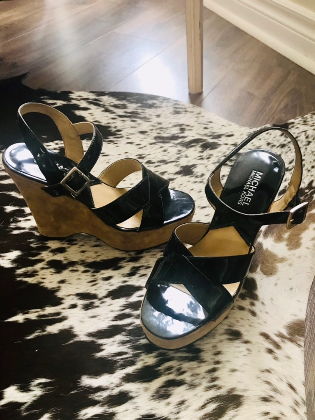 Michael Kors Women’s black patent leather and tan suede platform wedge sandals, 10cm height, size 5.5 US (fits a narrow 6), worn a couple of times *if it’s listed it’s available *cash only *discount if you buy multiple items