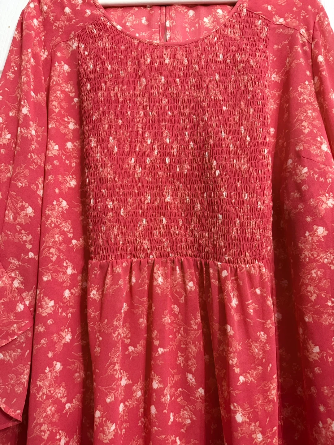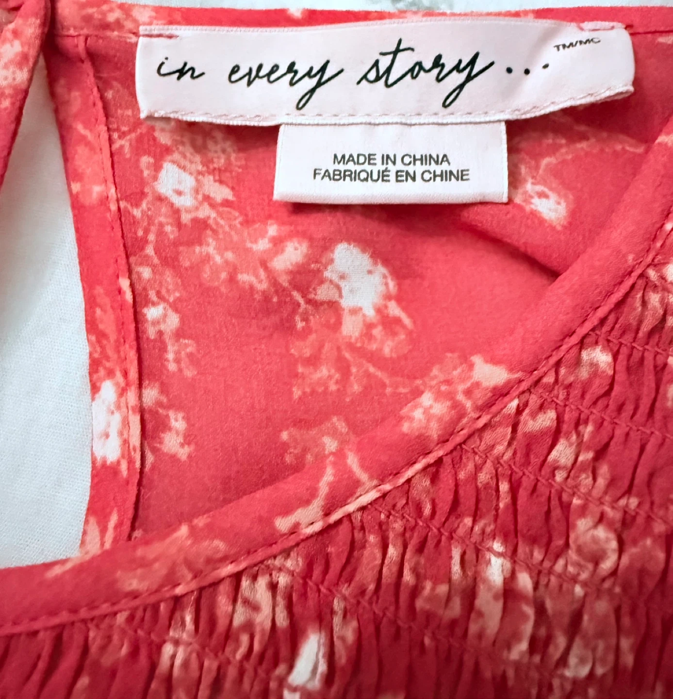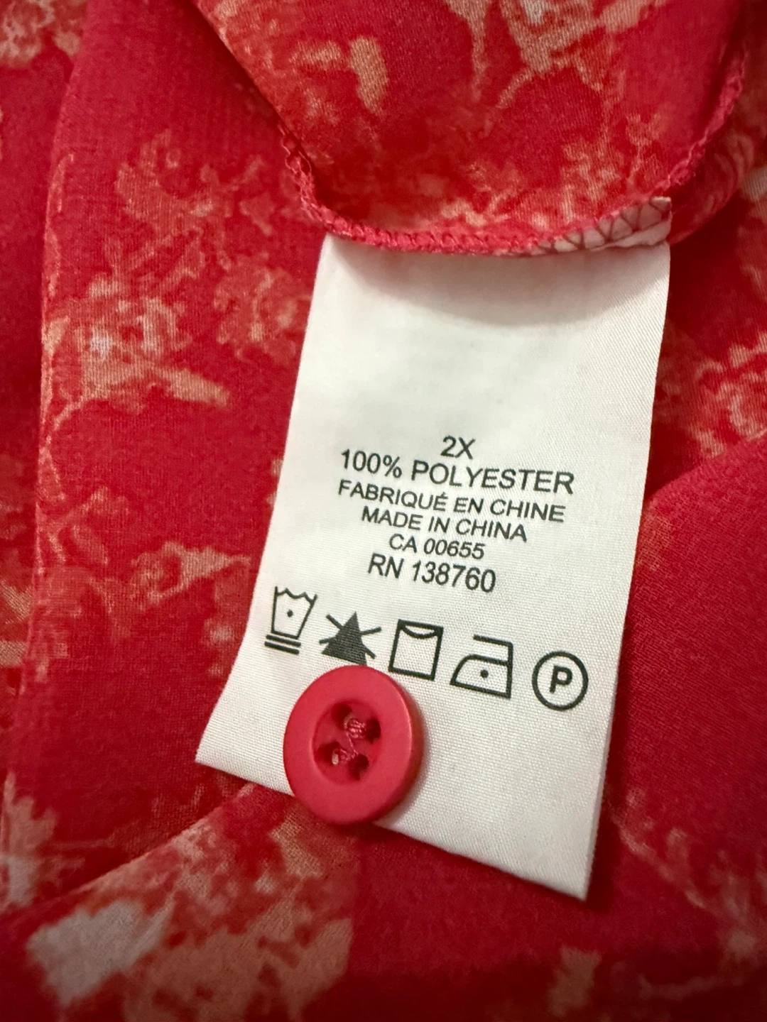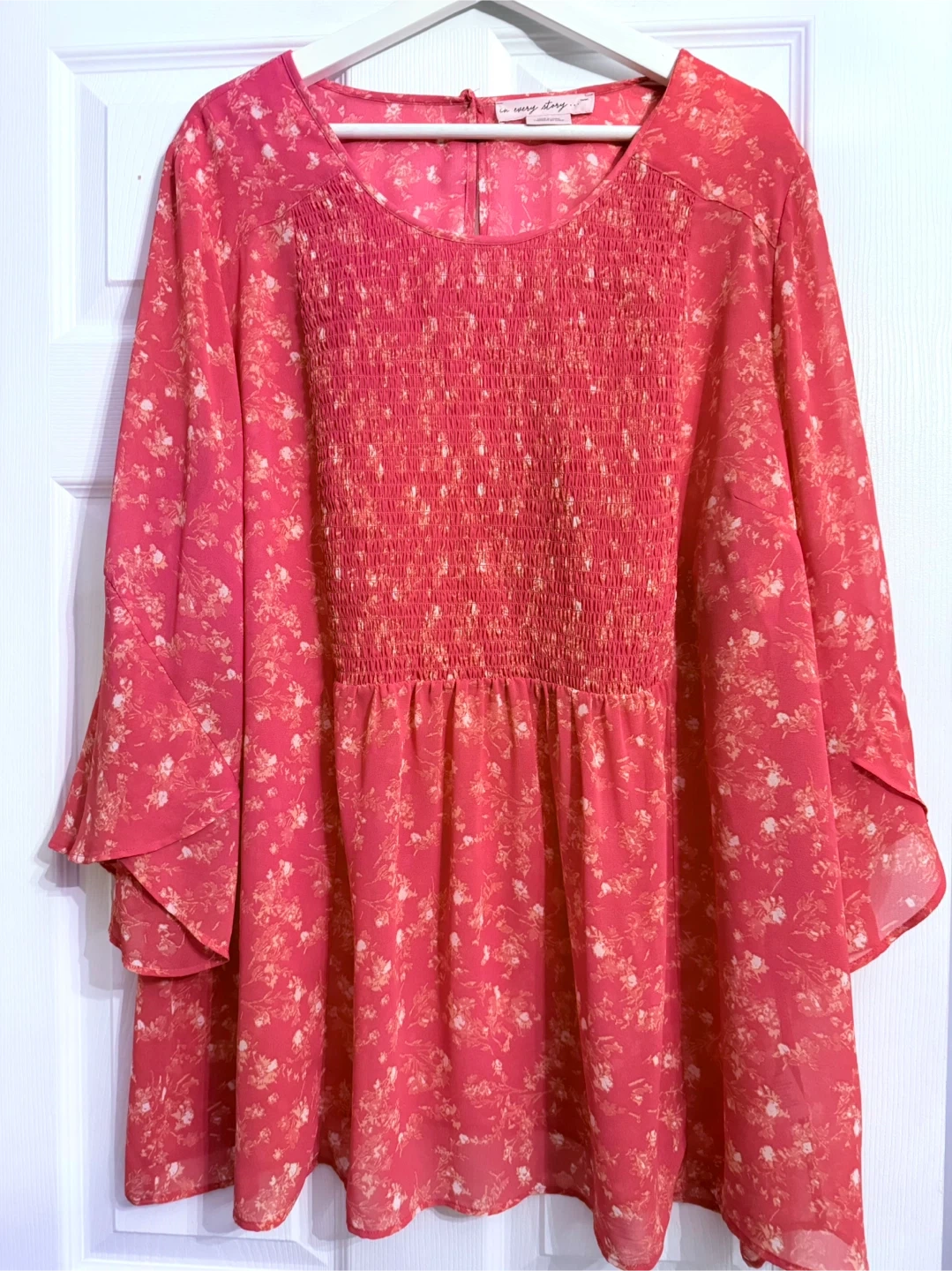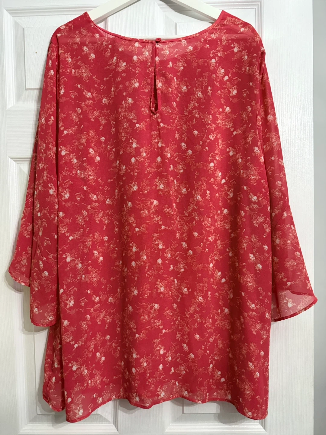 This lovely floral blouse from In Every Story is a size 2X. It's made of 100% polyester and features a pretty red and white floral pattern. Perfect for adding a touch of spring to your wardrobe! Ptp 28” Length 32”