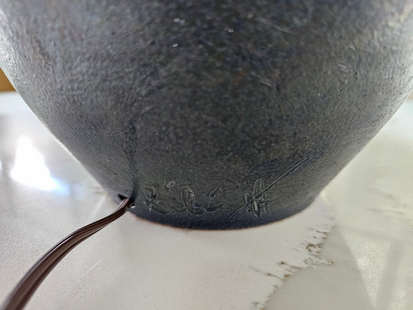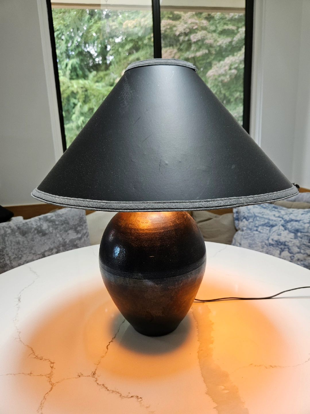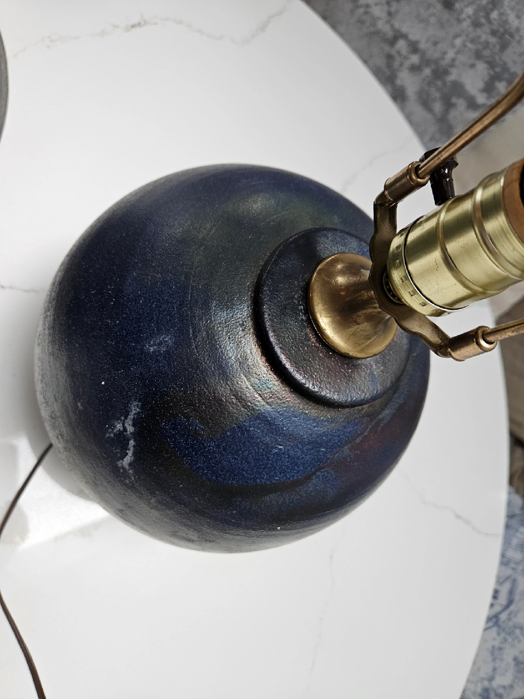 Large and Wide Ceramic Table Lamp with Shade that has a unique design and a nice, warm glow when lit. The lamp is in good condition and ready to brighten up your space! MCM style and signed by ceramicist