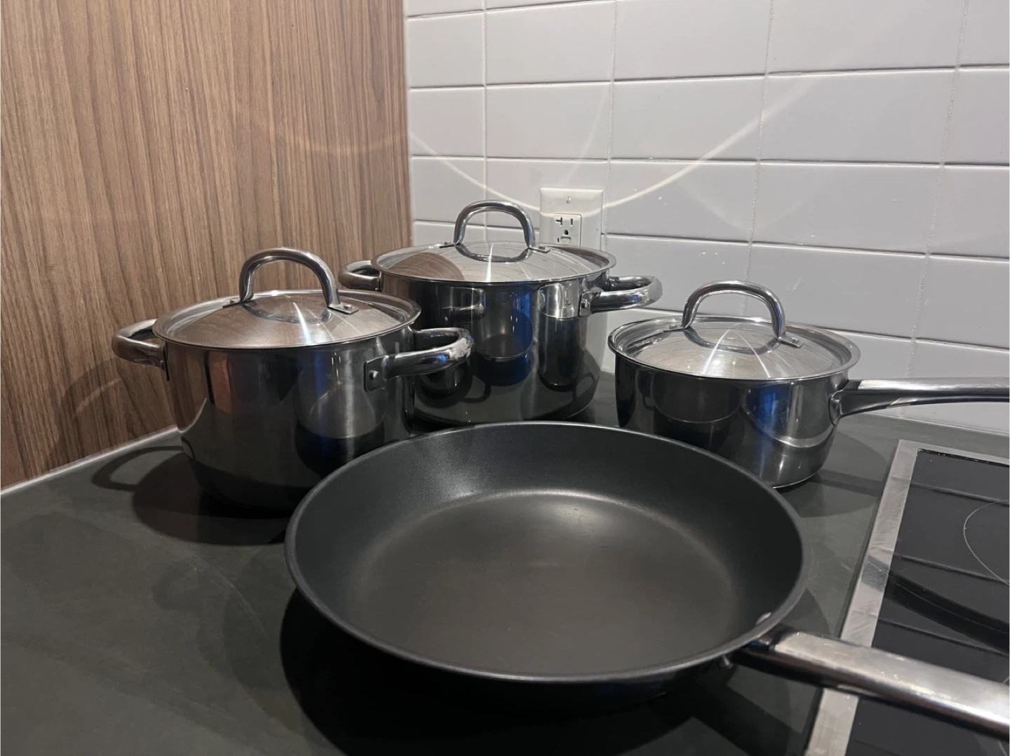 Selling a set of stainless steel pots and a frying pan. The set includes three different sized pots with lids and one frying pan.