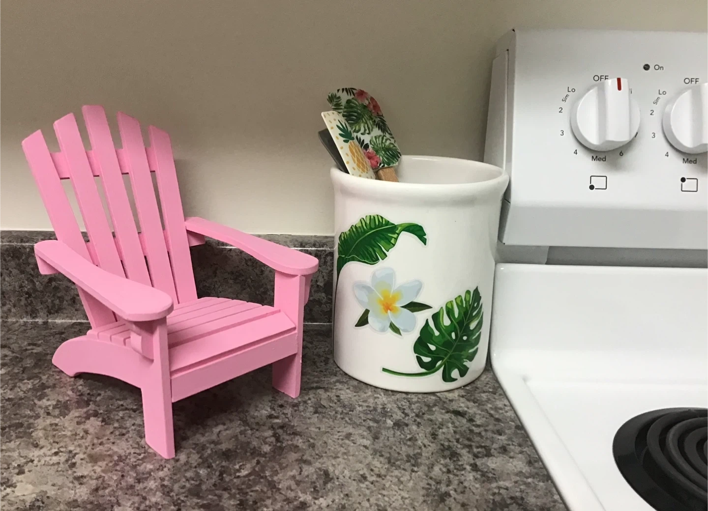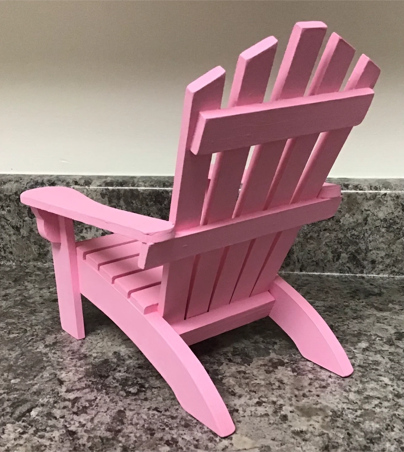 This cute pink miniature Adirondack chair is perfect for adding a touch of summer to any space! It's in great condition and would look lovely on a shelf or desk. It's a charming little piece to add to your home decor. Wooden, can be repainted. As is Info in photo, by utensils to show size $10.00 exact cash only Maybe good for a Christmas craft?
