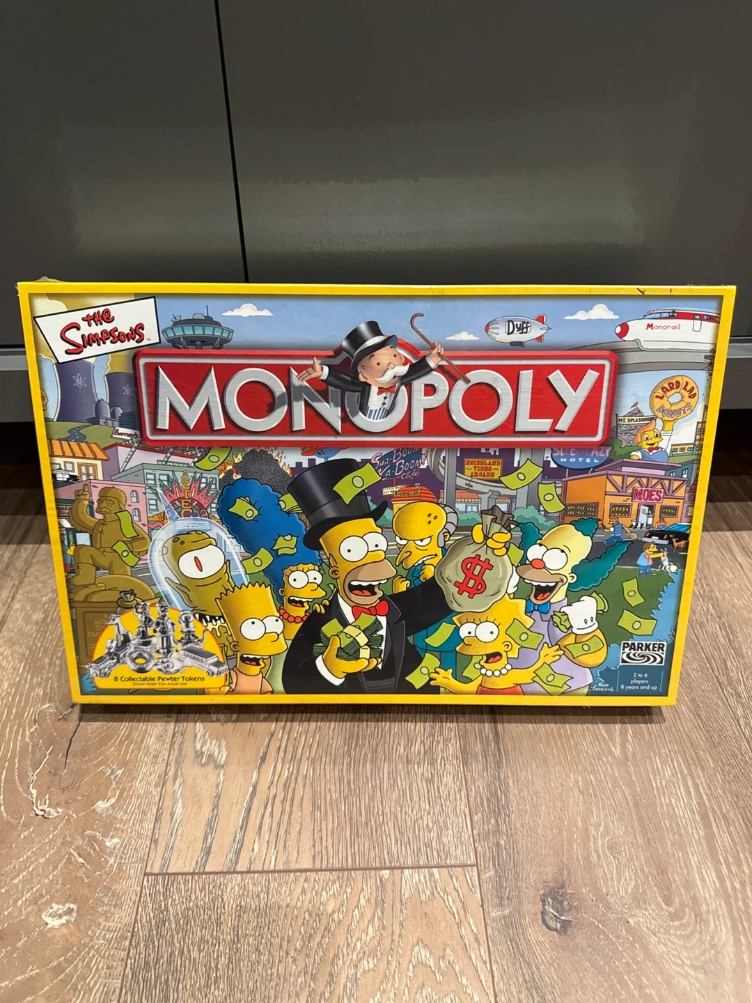 Brand new and sealed. Selling The Simpsons Monopoly board game! It's a fun twist on the classic game, set in Springfield. The box includes the game board, title deed cards, custom money and banker's tray, 32 houses, 12 hotels, 8 custom pewter tokens and rules. Hours of fun for Simpsons fans!