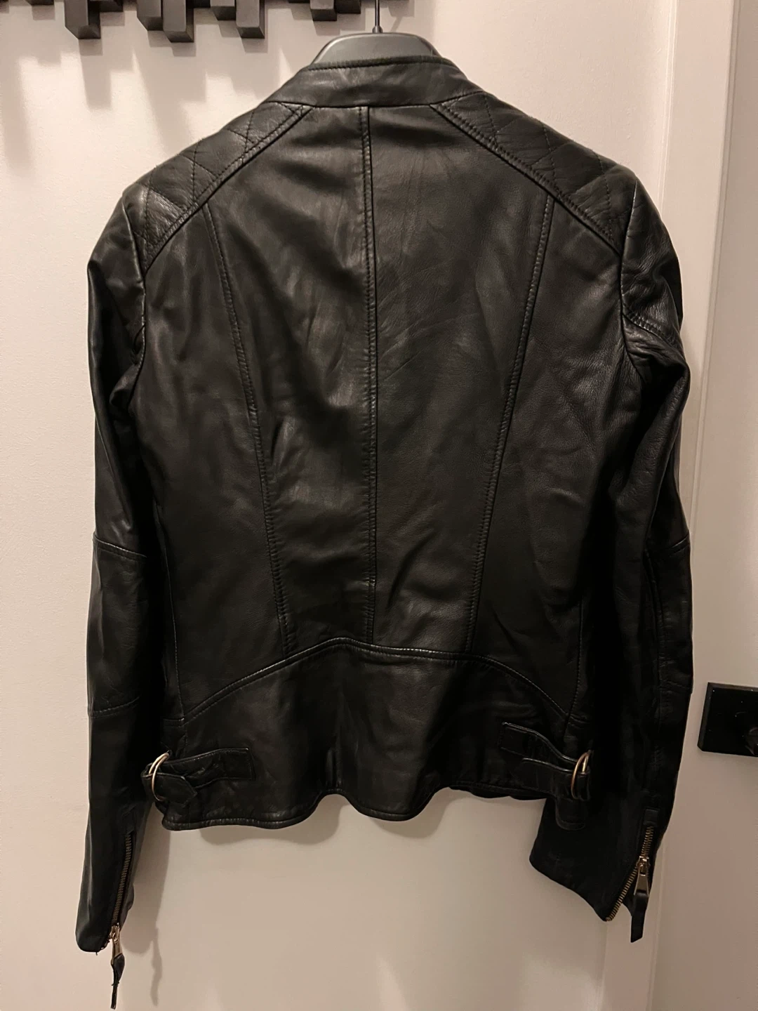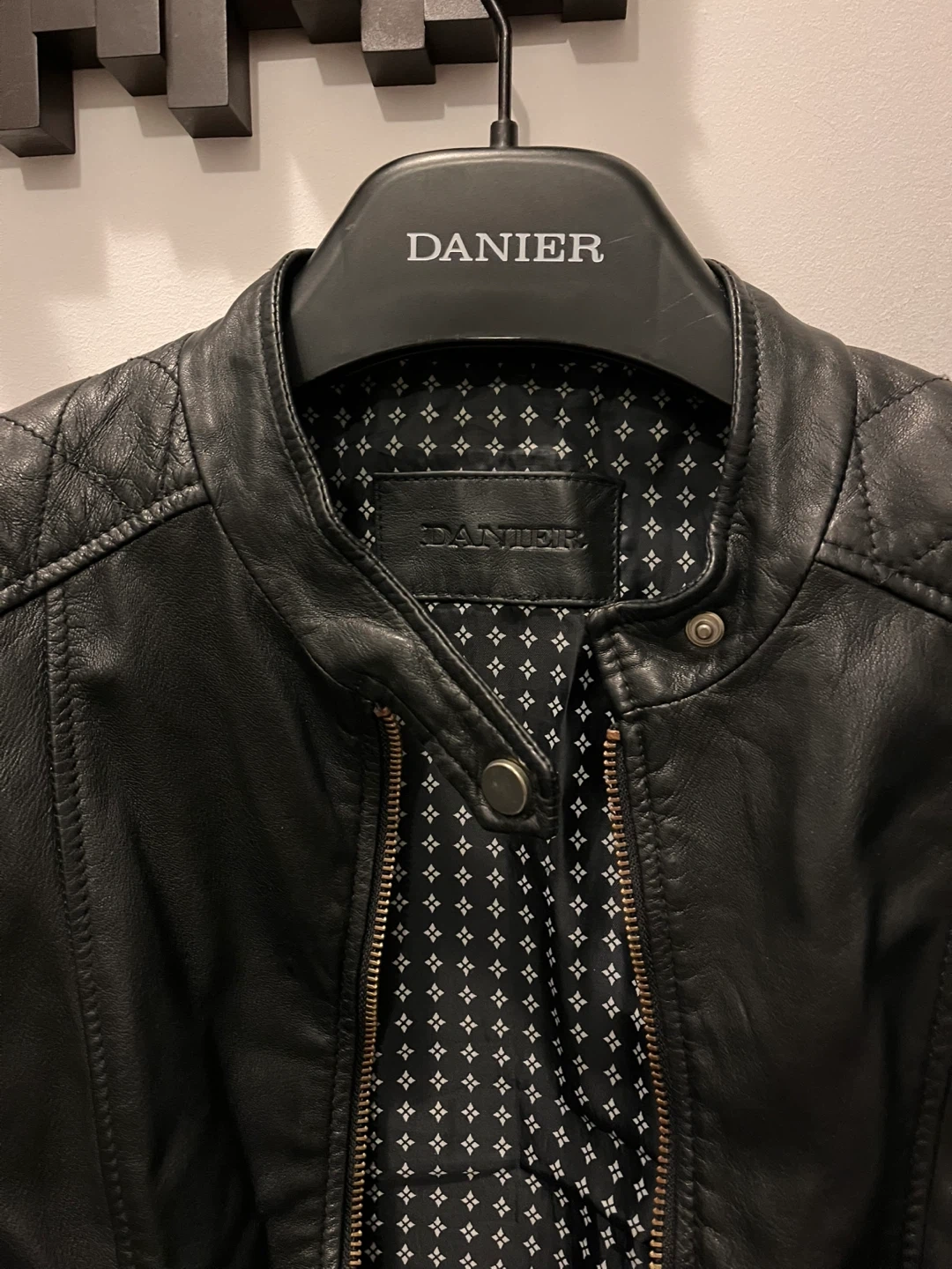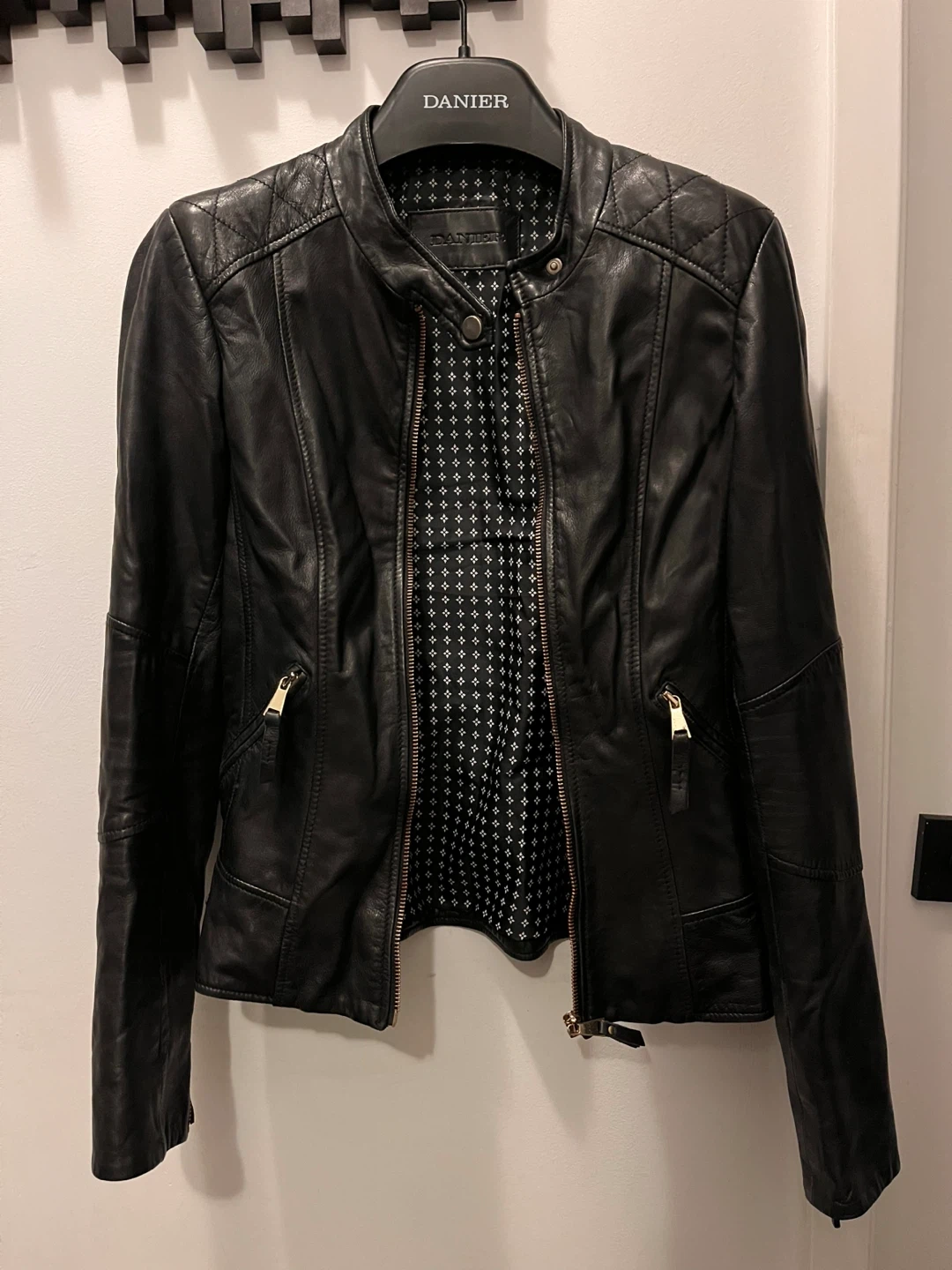 Danier black 100% genuine leather jacket with gold hardware. Quilted shoulder detail. Two exterior pockets. Adjustable waist loops. Zippers at the cuff of the sleeve. Size 3XS (UK 4) Pick-up midtown Toronto (near Dupont subway station)