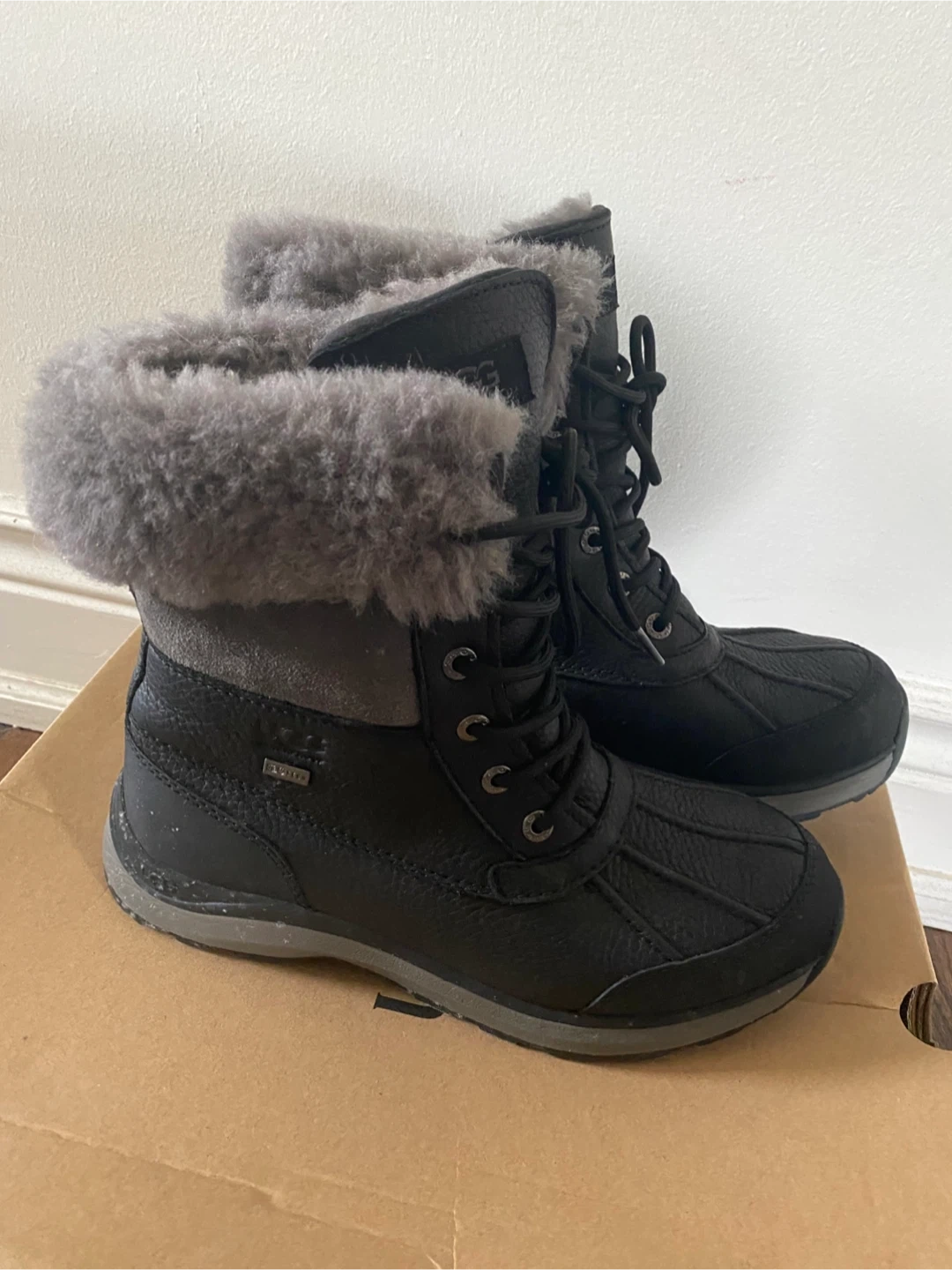 Ugg Adirondack III Black Winter Boots, Size 7.5 Cozy and stylish Ugg Adirondack III winter boots in black! These boots are perfect for keeping your feet warm and dry during the cold Canadian winters. They feature a waterproof leather upper, a plush wool lining, and a durable rubber sole for great traction. Great for all weather conditions!