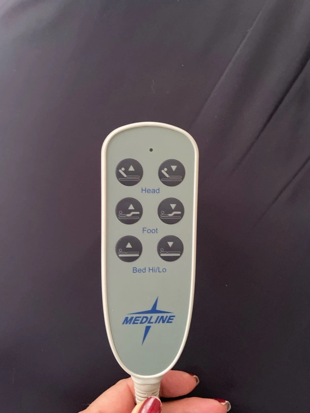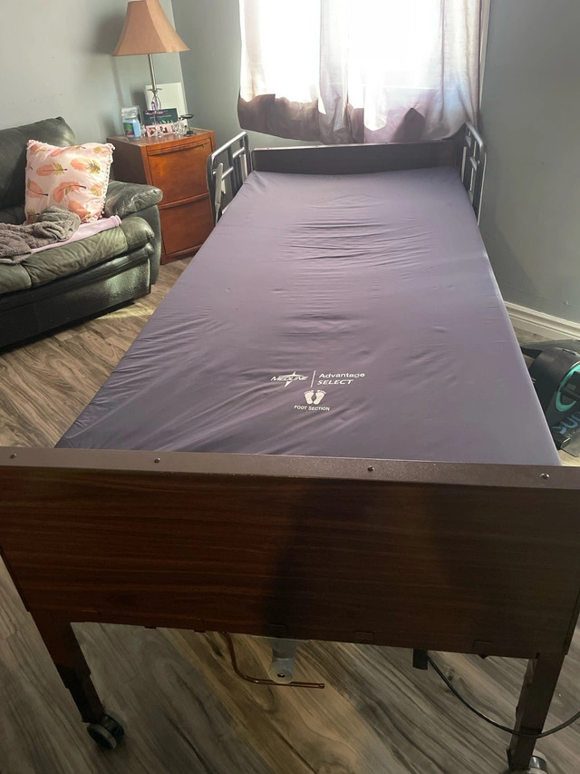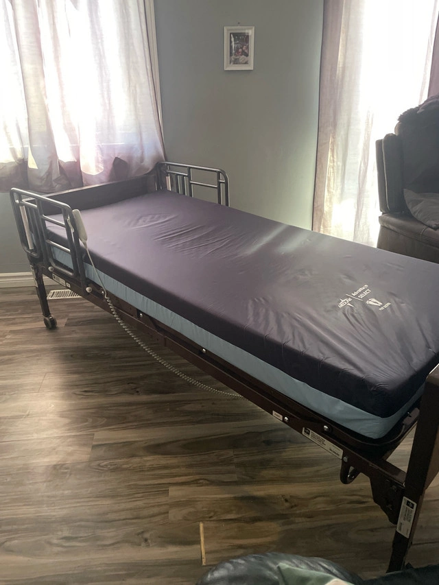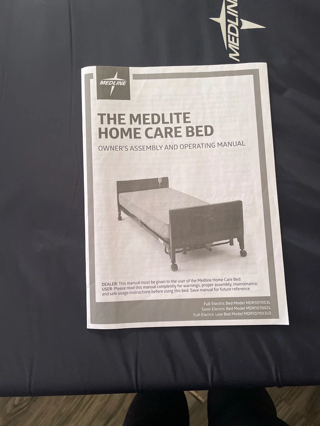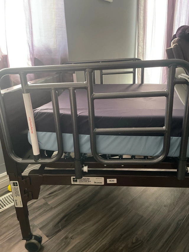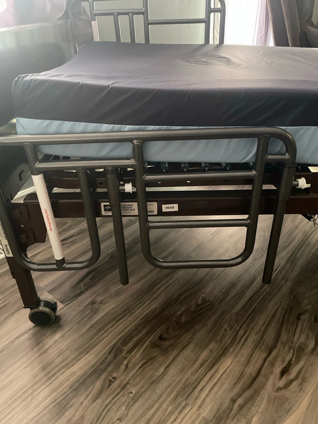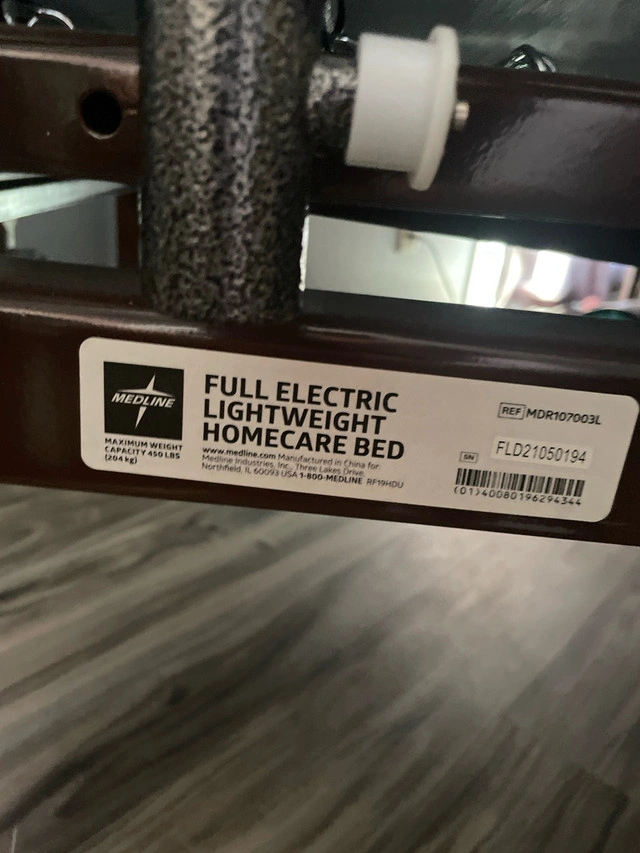 Medline full electric lightweight home care bed. Has crank incase of power failure. Wheels lock and unlock to be able to move bed easily. Bed has side rails. They can be removed if not needed at moment. They also move up and down to make easy care. Bed still together would need to be dissembled.