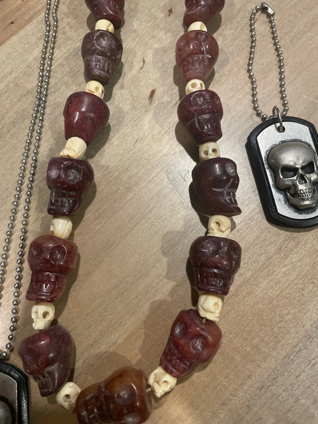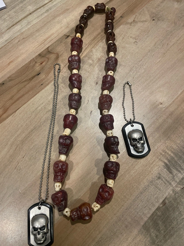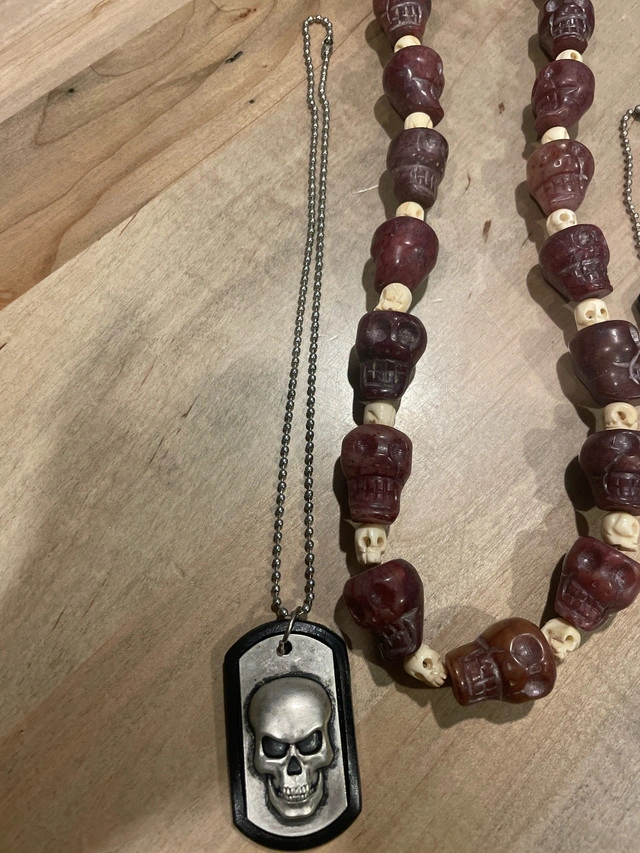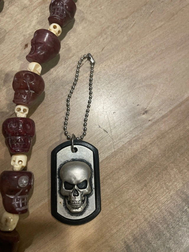 Add a unique touch to your style with this pre-owned skull necklace and matching dog tag pendants. The necklace features intricately designed skull beads, while the pendants add an edgy flair to any outfit. Both the necklace and pendants show some signs of wear, which only enhance their unique character. If this ad is still up, then yes, it is still available!