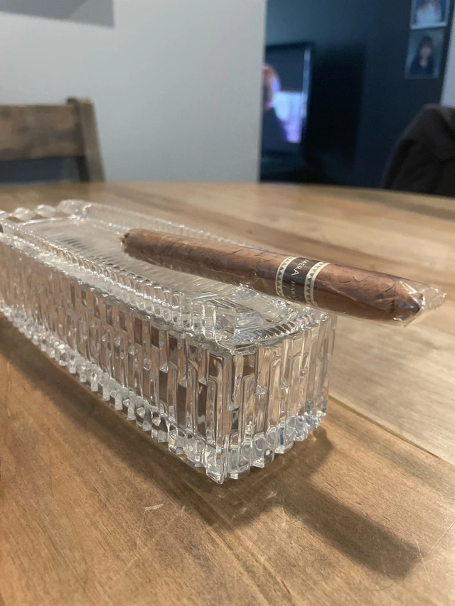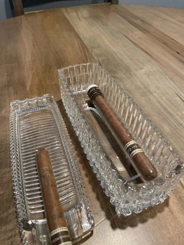 This is a stunning, clear crystal glass cigar ashtray that will add a touch of elegance to any smoking area or collection, perfect for cigar aficionados or as a sophisticated decorative piece. The piece is in good condition, with no major flaws or damage. * Material: Clear Crystal Glass * Style: Elegant, decorative * Intended Use: Cigar Ashtray, Decorative Piece The average sales price on Kijiji is $30 CAD. If the listing is active, the item is available for purchase.