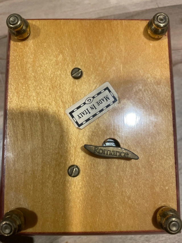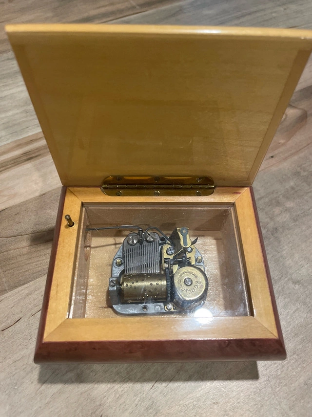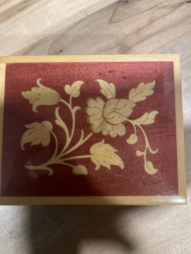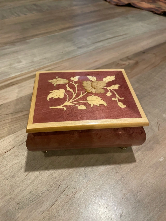 This is a Reuge Music Box with marquetry floral design, a beautiful and elegant piece that plays a sweet melody. It's in good condition, showing some signs of use that add to its vintage charm.