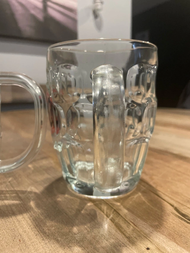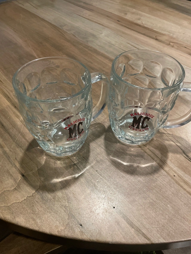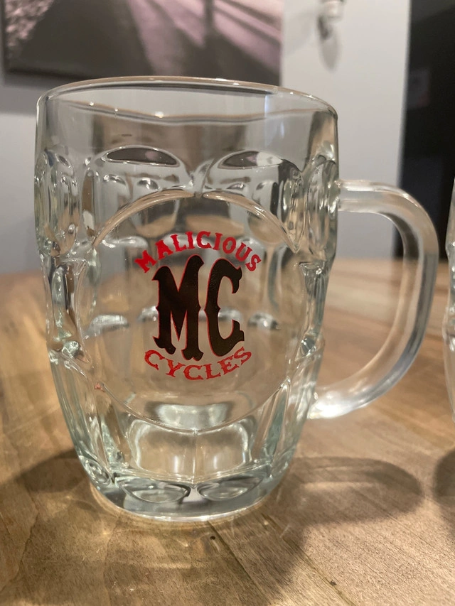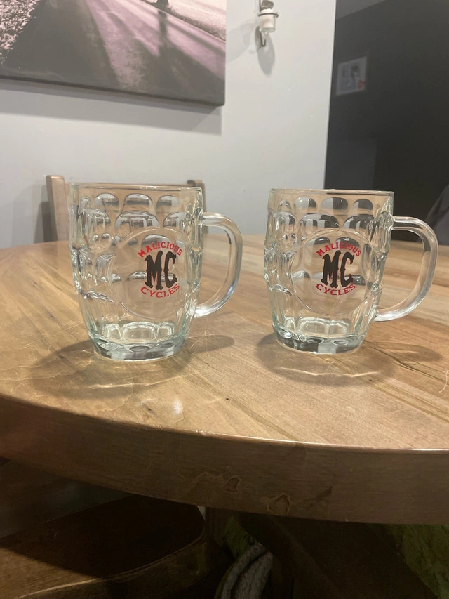 I'm selling a pair of Malicious MC Cycles glass beer mugs. These used mugs are perfect for any motorcycle enthusiast looking to add some edge to their barware collection. They're in good condition, ready to hold your favourite brew. Get ready to raise a toast to the open road! If you're reading this, yes, they're still available!
